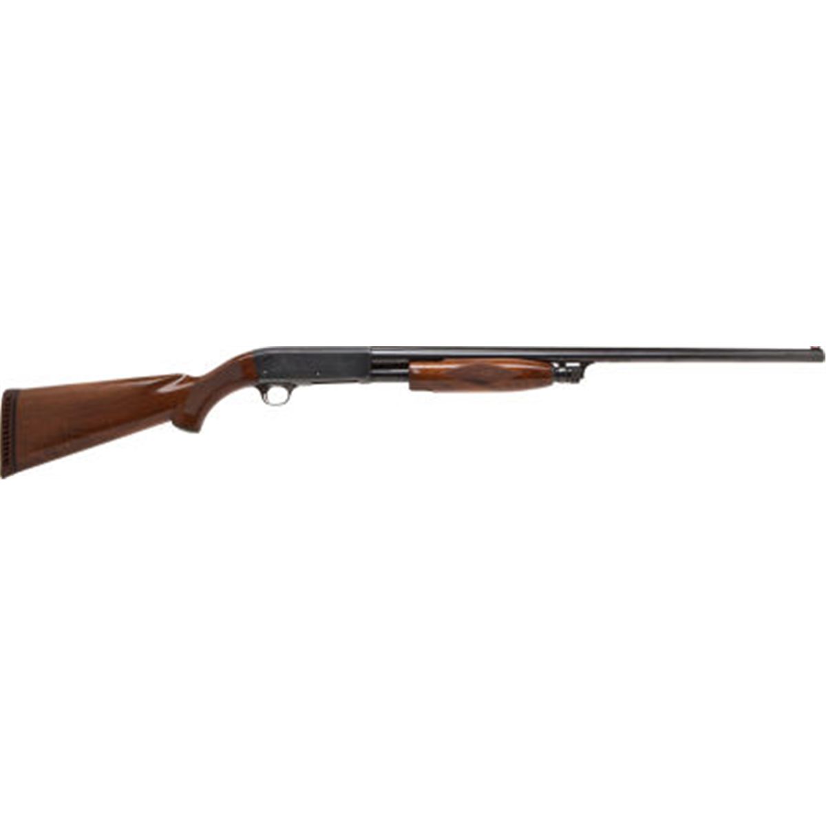 20 Gauge Ithaca Model 37R Deluxe Featherweight Slide Action Shotgun. Serial no. 727015-1. 20 gauge. 26-inch barrel with solid rib. Blued slide action. Checkered pistolgrip stock of partially figured walnut. Recoil pad. Checkered enlarged fore-end. Choke: Improved Cylinder. Condition: Very Good. Metal shows 90-95% bluing. Bright bore. Wood shows a considerable number of nicks and scratches. NRA FIREARMS FOR FREEDOM PROGRAM