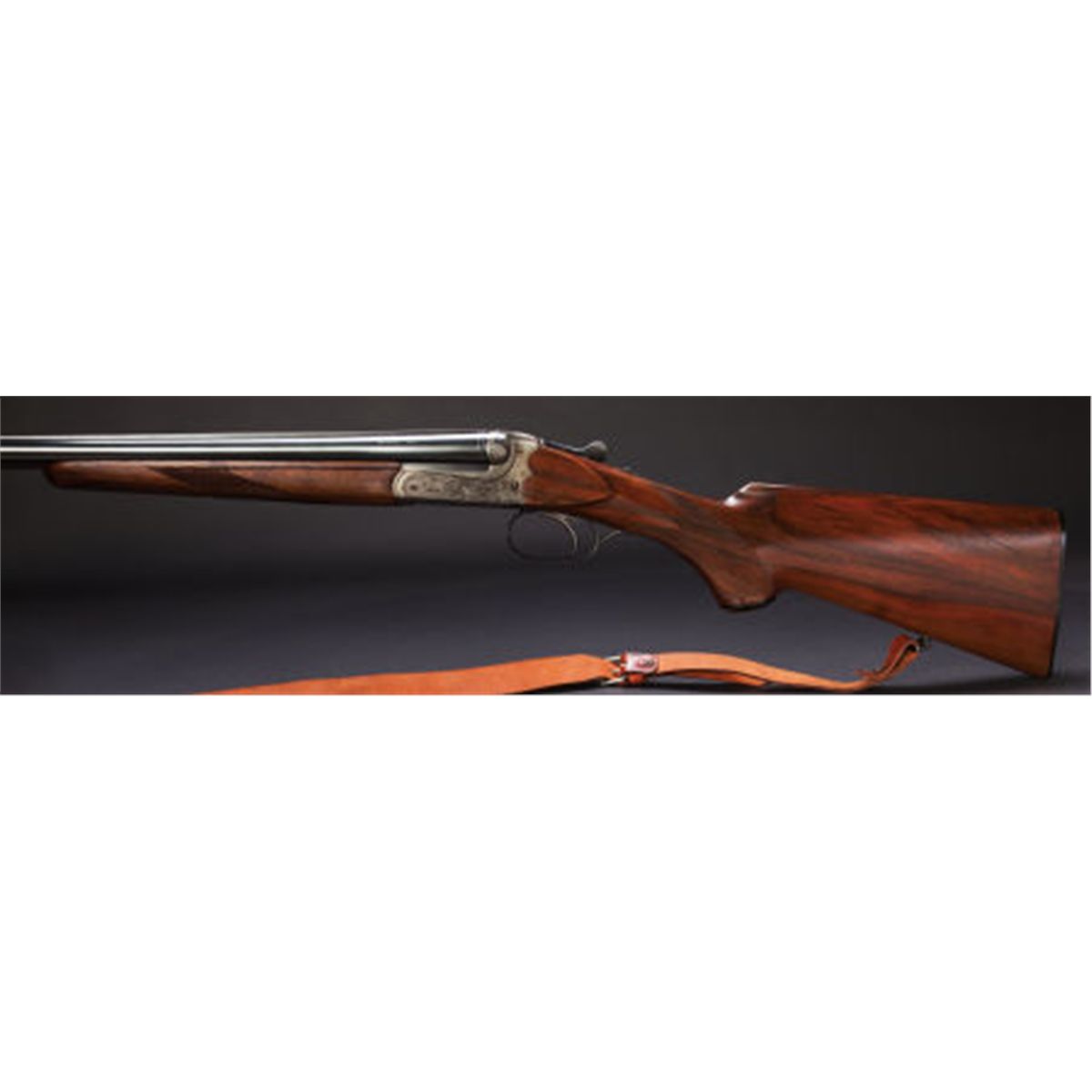 **20 Gauge Merkel Boxlock Ejector 147E Boxlock Ejector. Serial no. 735982. 20 - 3-inch gauge. 26-inch barrels with a matted concave rib with extension. French gray boxlock reinforced and scalloped action with foliate scroll and game scene engraving. Game scenes are pheasants and ducks in field and marsh settings. Side clips, Greener-style cross bolt. Intercepting safety. Cocking indicators. Automatic safety. Single non selective trigger. Finely checkered pistol grip stock of contrasting figured walnut. Hard rubber grip cap and buttplate. Checkered splinter fore-end with Deeley-Edge style release. Sling swivels with leather sling. Data: Barrel Dimensions: Bores: 0.629/0.629 inches. Chokes: 0.012/0.025 inches. Chambers: 3 inches. Proof: German Nitro, 20/76, 973. Stock Dimensions: Pull: 14 1/4 inches. Drop at comb: 1 3/8 inches. Drop at heel: 2 1/8 inches. Cast-off: 1/8 inches. Weight: 6 pounds, 5 ounces. Condition: Excellent, showing limited use. Barrels show 99% blued finish. Excellent bright bores. Triggerguard shows 99% bluing. Action shows no wear to finish. Stock shows a few very light marks. Fore-end shows a couple of impressions and light marks.