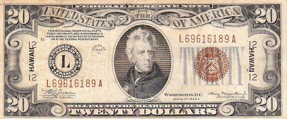 $20 HAWAII EMERGENCY ISSUE FRN 1934 ALWAYS POPULAR