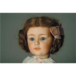 Lot 135: 20" HEUBACH 7347 POUTY CHARACTER. A charming character with blue glass sleep eyes and a large, well-defined mouth. This doll is on a German ball-jointed composition body finish on lower legs not consistent with remainder of body). She is wearing an antique white dress highlighted with pink ribbons, a sandy brown human hair wig with braids over the ears and antique leather shoes. CONDITION: Bisque has some light brown speckling throughout but does not detract from the overall appeal and appearance. 1-761 JL231
