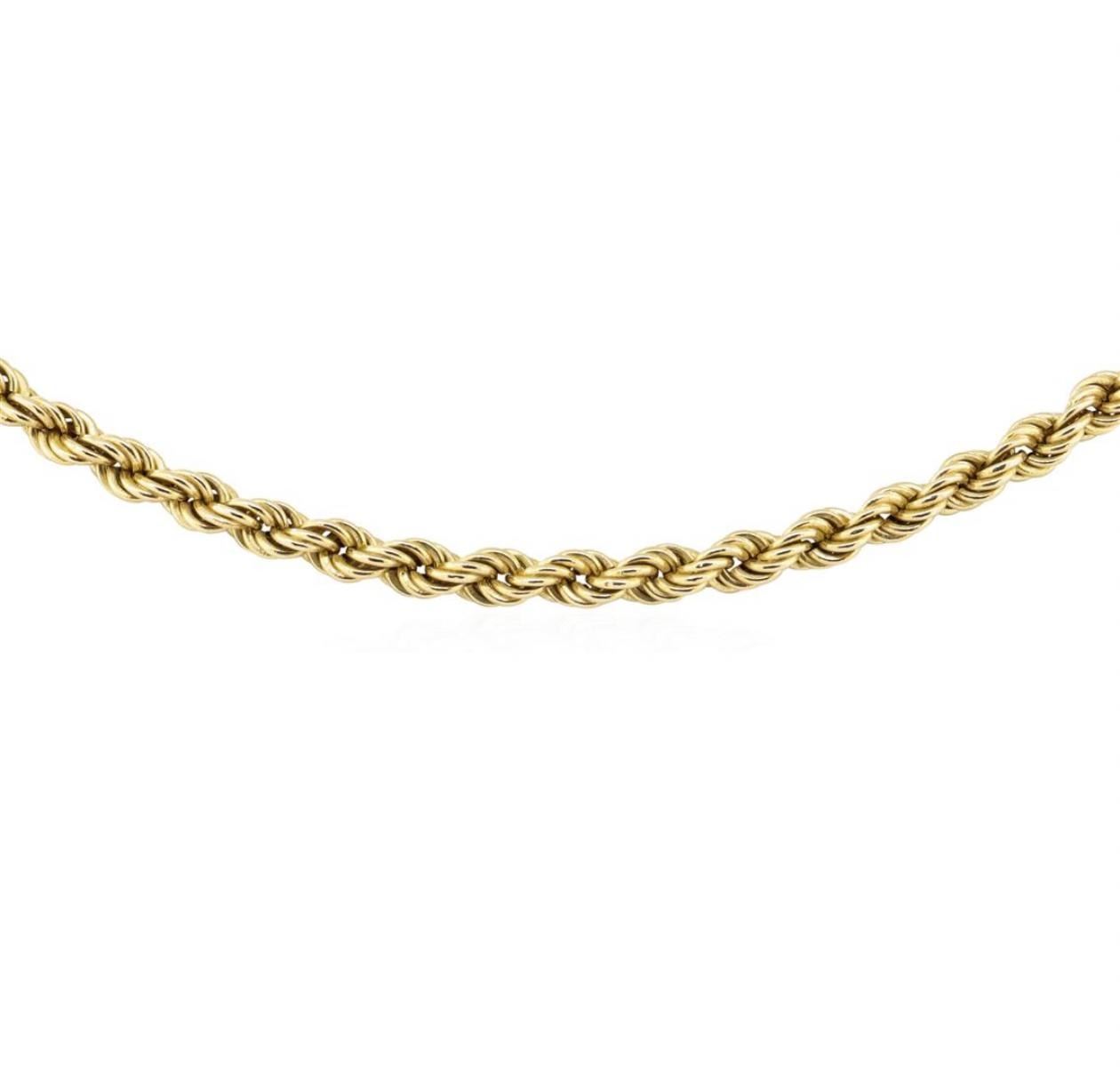 One 4mm wide rope chain measuring 20 inches long featuring: 14KT yellow gold weighing 12.1 grams.