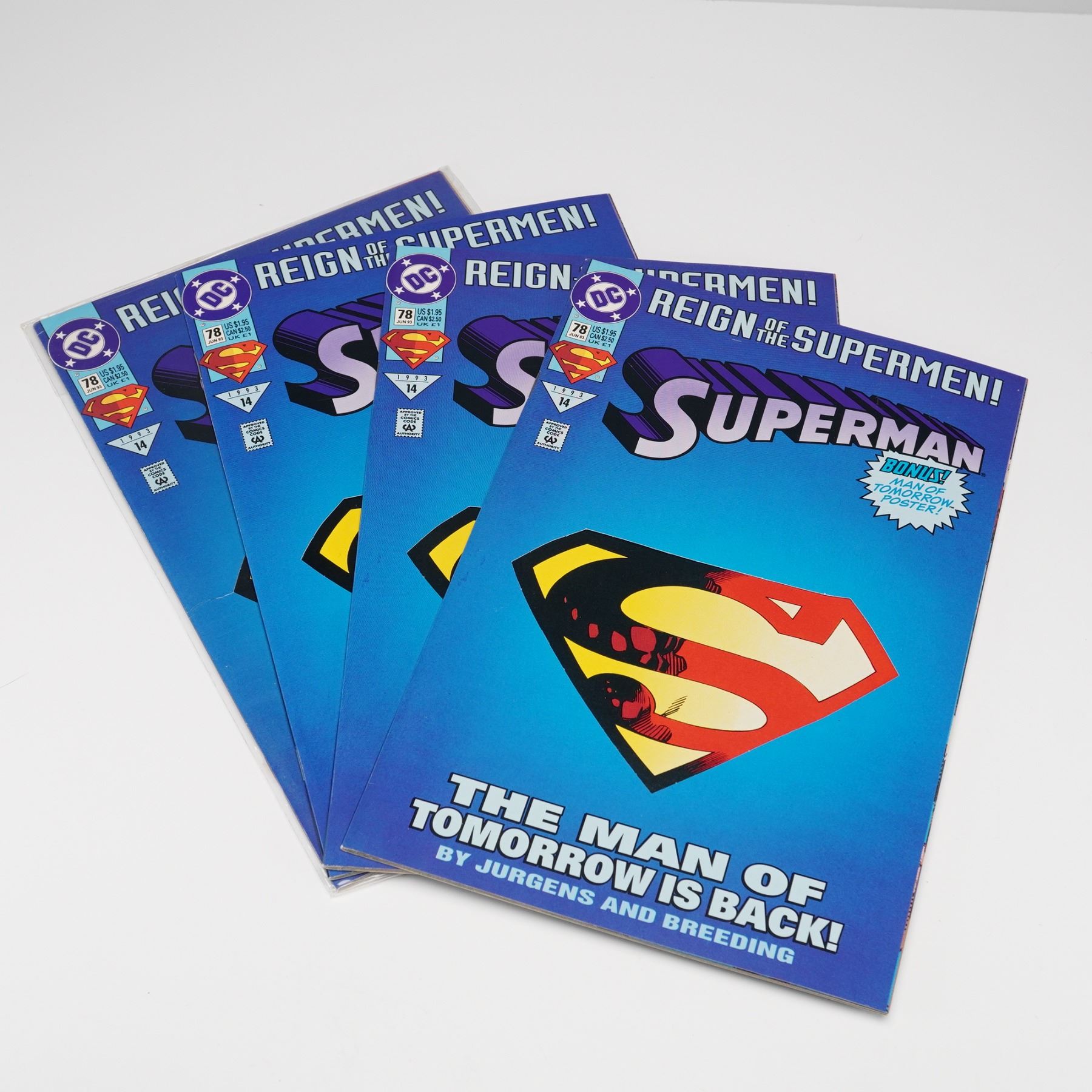 From the celebrated "Reign of the Supermen!" story line, chronicling the aftermath of "The Death of Superman" and the rise of four new heroes vying to claim his mantle. This lot includes multiple titles from "Action Comics", "Adventures of Superman", "Superman: The Man of Steel", and "Superman: The Man of Tomorrow", each featuring distinct story arcs introducing characters such as the Cyborg Superman, Superboy, Steel, and the Eradicator. Highlights include notable issues like "Superman #78: The Man of Tomorrow is Back!", "Action Comics #68" This set of issues is graded at (VG) or Very Good.