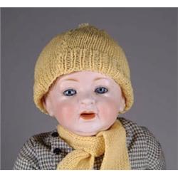 20” JDK 211. 211 baby on a generic composition child body (repainted) dressed in houndstooth wool outfit and yellow scarf and cap. CONDITION: Peppering bisque, doll lacking teeth. 1-2584