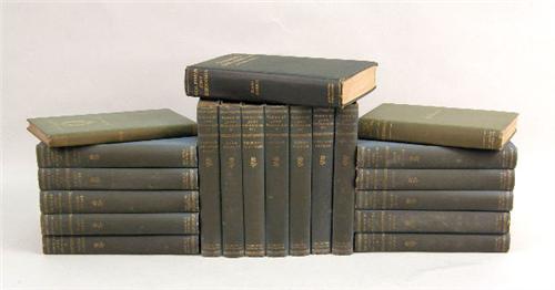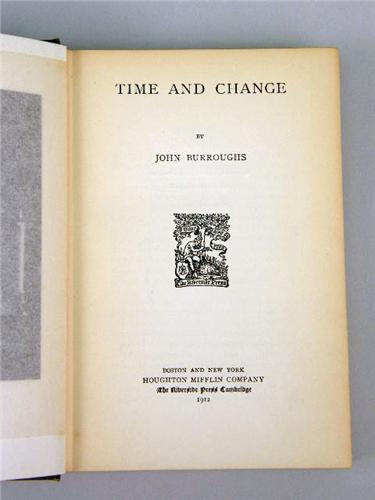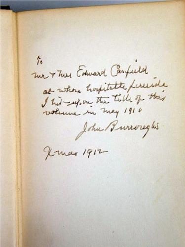 The Writings of John Burroughs: the Riverby Edition in seventeen volumes, Houghton, Mifflin and Company, Boston and New York, 1904, each signed, the first one dated by the author in 1918, volume II extra-illustrated with three original photographs of Burroughs. Together with "Time and Change", Houghton Mifflin Company, Boston and New York, 1912, inscribed "To Mr & Mrs. Edward Canfield at whose hospitable fireside I sit - upon the title of this volume in May 1910/John Burroughs, Xmas 1912", "Bird and Bough", Houghton Mifflin Company, Boston and New York, 1906, inscribed "To Mrs. Jane H. Canfield with remembrances from John Burroughs/April 5, 1906", and "Our Friend John Burroughs" by Clara Barrus, including autobiographical sketches by Mr. Burroughs, Houghton Mifflin Company, Boston and New York, and the The Riverside Press Cambridge, 1914, signed by Burroughs on the title page, inscribed "Dear Mrs. Canfield, I hope when you read these pages they will recall the happy hours when we have wandered with our friend by the ...? with ...?, and sat by your fireside at Stoney Croft and before the Franklin Store at Woodchuck Lodge. Affectionately Yours, Clara Barrus /February 12, 1915". Estate of Betsy Canfield Rorty, descendant of Edward Canfield of Middletown, NY