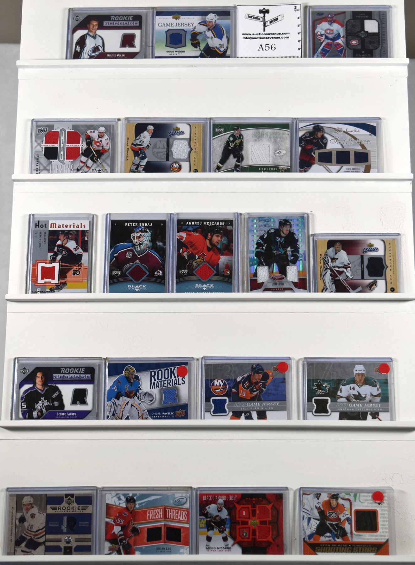 20 Jersey Cards, including Wojtek Wolski, Doug Weight, Jose Theodore, Kris Russell /599, Sergei Zubov, Mark Parrish, Dion Phaneuf, RJ Umberger, Bill Guerin, Jonathan Cheechoo, Keith Primeau, 10-11 Certified Logan Couture 111/150