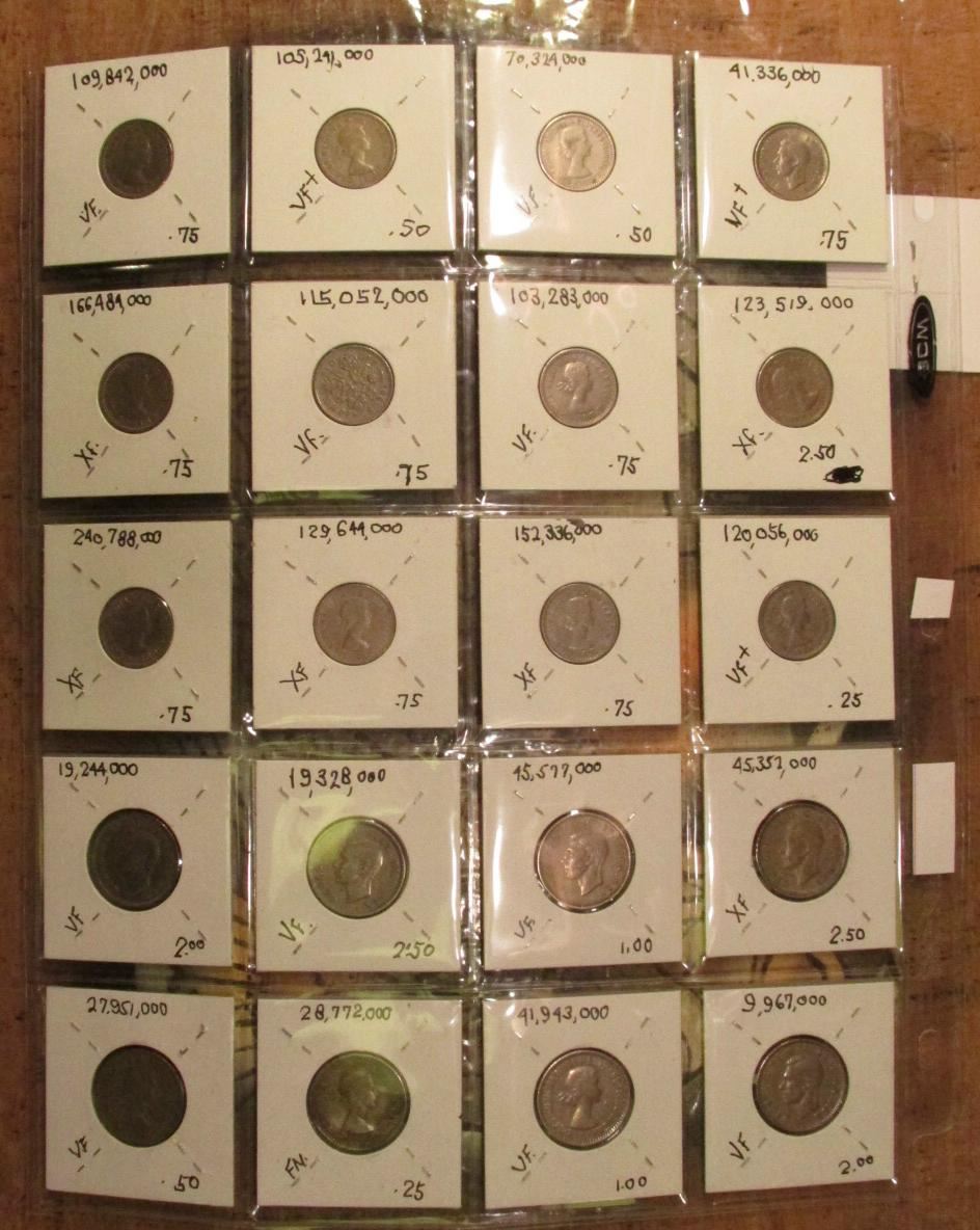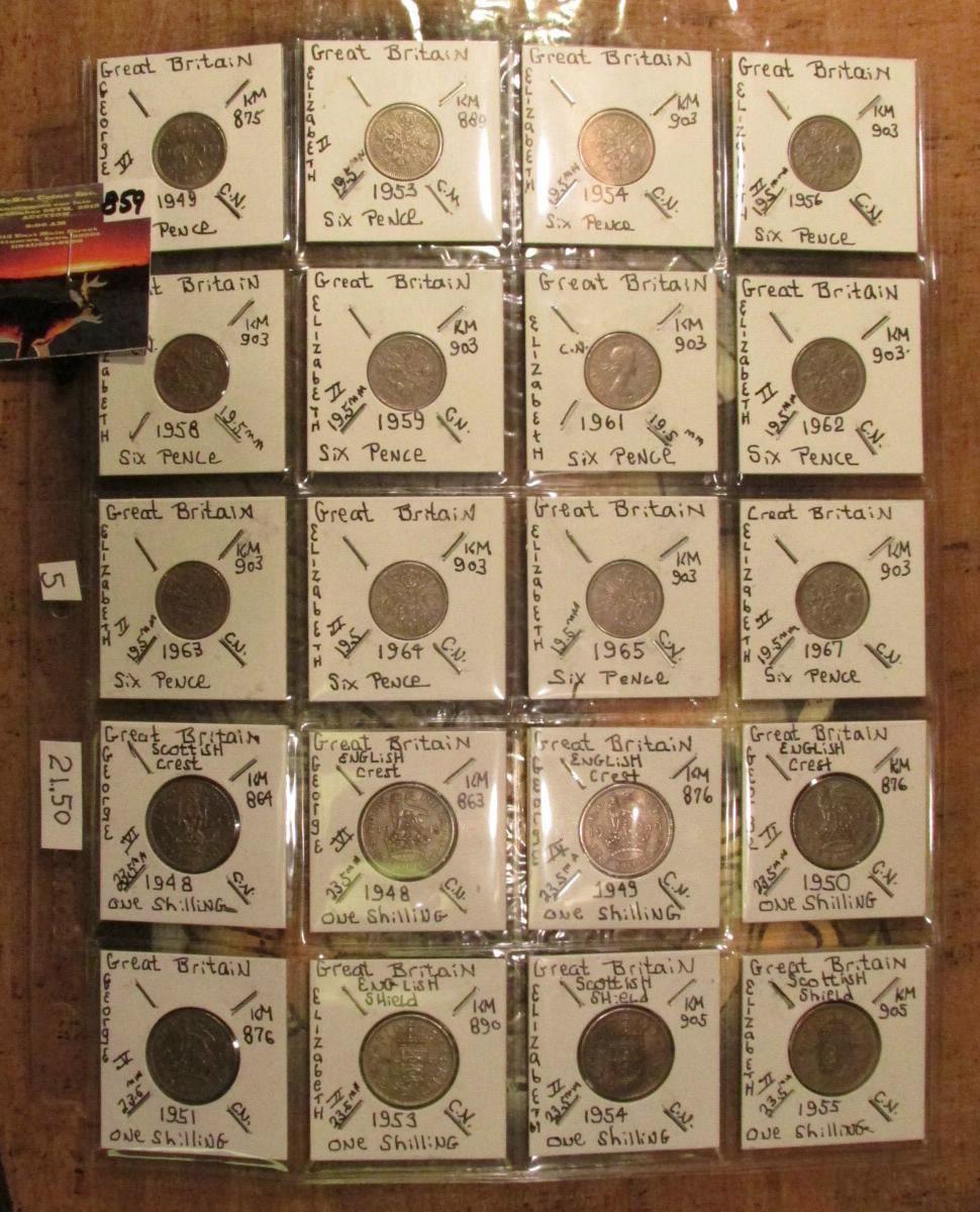 (20) Mixed British Six Pence and Shilling Coins in 2" x 2"s and a plastic page. All identified and attributed. KM value $21.50.
