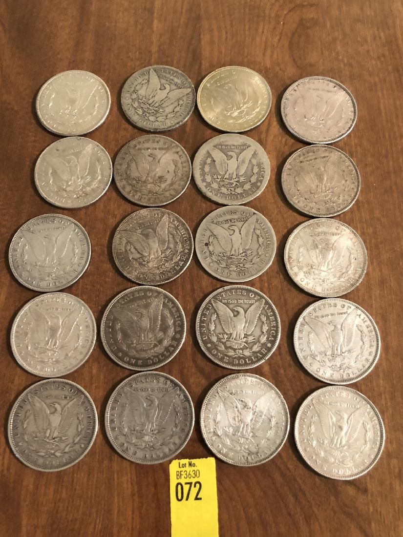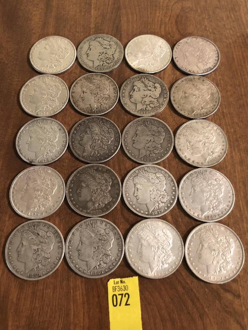 20 Morgan Silver Dollars; 1881-S, 1881-O, 1882, 1882, 1878, 1878-S, 1878, 1882, 1878, 1878-S, 1878-S, 1879, 1879, 1879-O, 1880, 1880, 1880-O, 1879, 1880-O, and 1880. (RL)