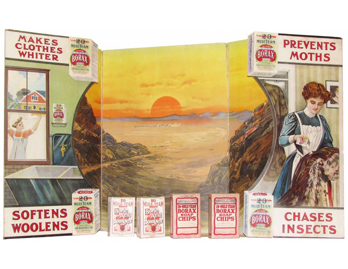 20 Mule Team Borax Die Cut Window Store Display. Excellent color and graphics. Comes with product. Slightly dog eared otherwise excellent condition. 37 X 27 X 9 inches assembled.
