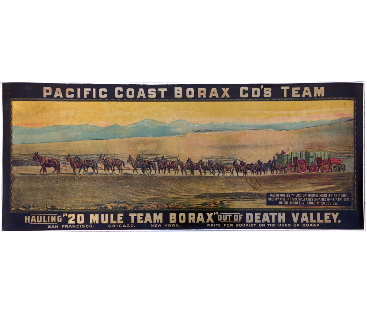 This is a very rare broadside put out by Pacific Borax in early 20th century. It measures 15" x 40" and is mounted on a thin canvas material. This lithograph is in excellent condition with very vivid colors. -61215