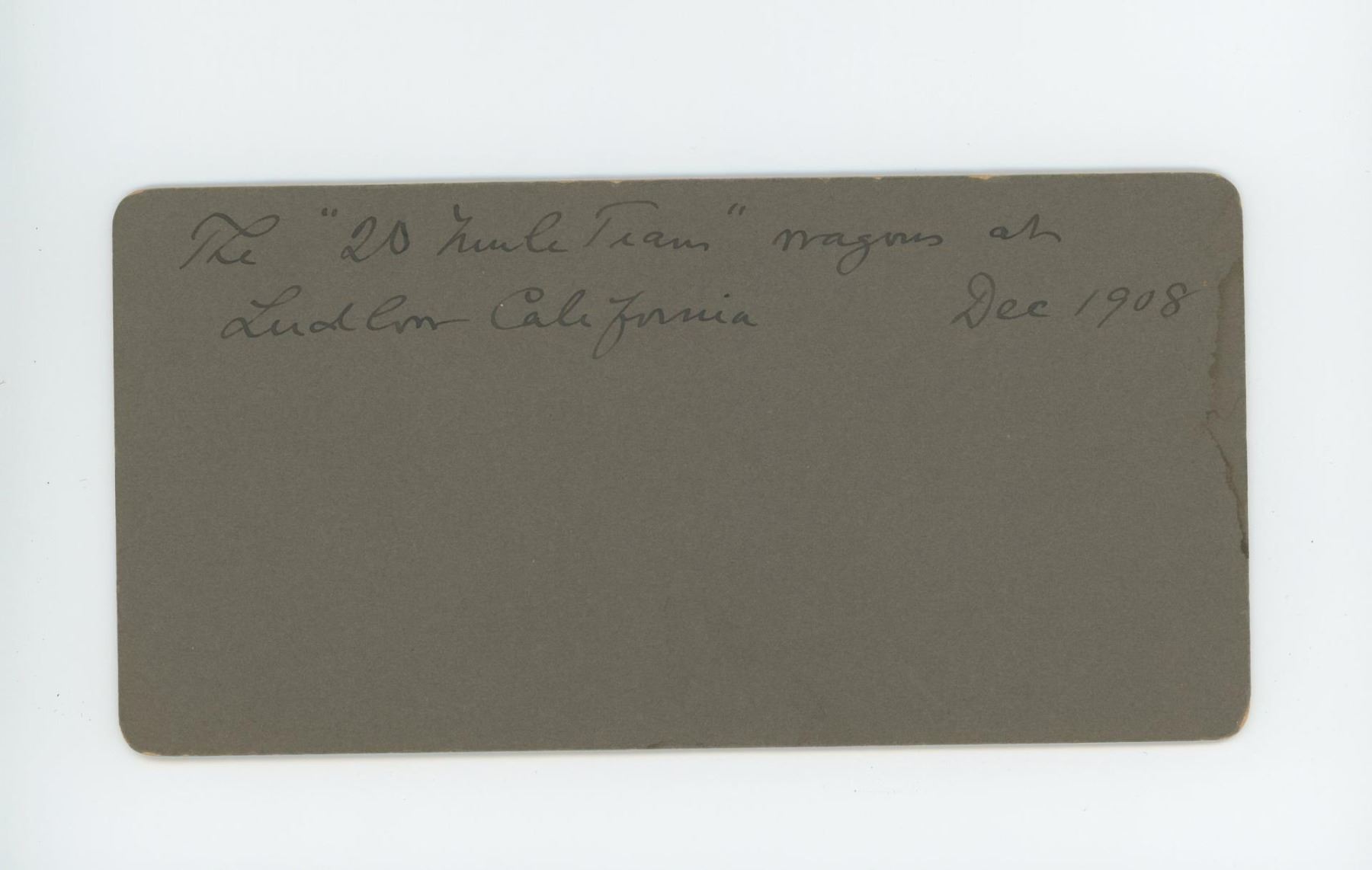 Noted on reverse is The 20 Mule Team wagons at Ludlow, California Dec 1908.