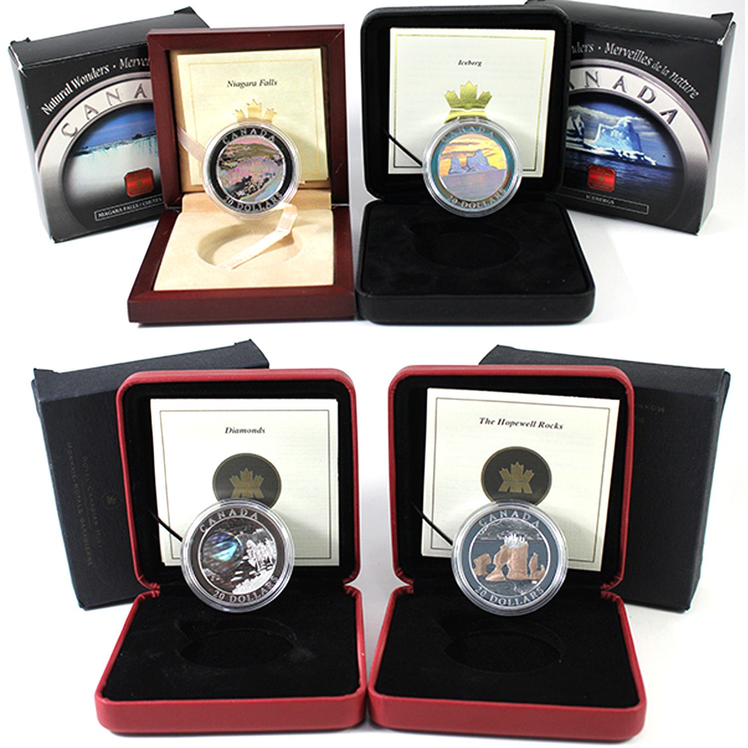 $20 Natural Wonders; 2003 Niagara Falls, 2004 Icebergs, 2004 Hopewell Rocks, & 2005 NWT Diamonds 1oz .9999 Silver. Light toning; scuff on reverse of Niagara Falls coin. Some tears and/or writing to outer sleeves or scratched capsules. 4pcs. (Tax Exempt)