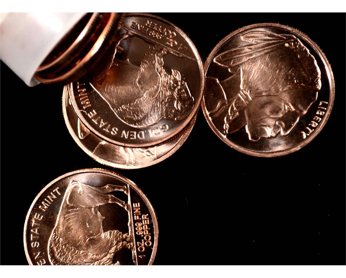 ( 20 ) ONE ROLL OF ONE OUNCE .999 COPPER ART ROUNDS, "BUFFALO NICKEL" REPLICA