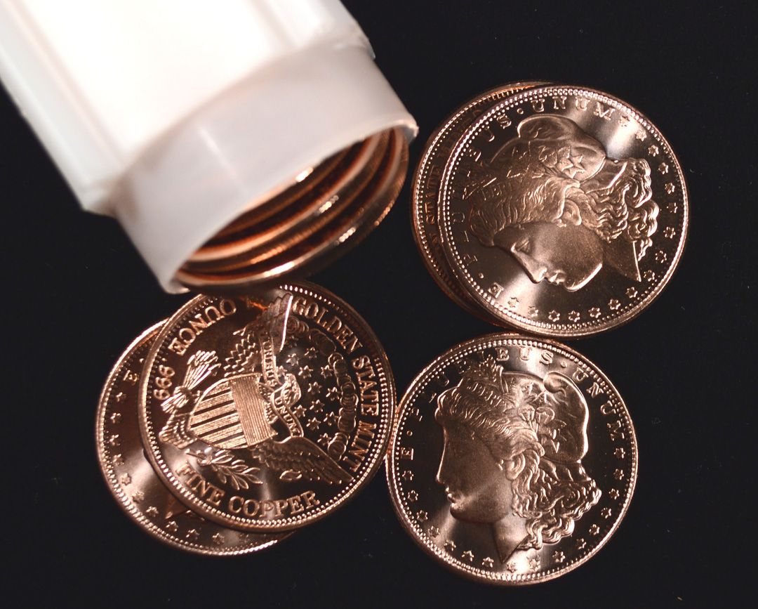 ( 20 ) ONE ROLL OF ONE OUNCE .999 COPPER ART ROUNDS, "MORGAN HEAD" REPLICA