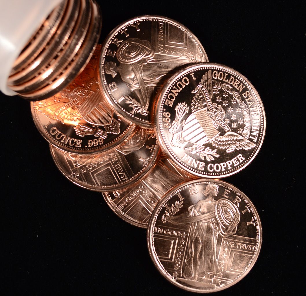 ( 20 ) ONE ROLL OF ONE OUNCE .999 COPPER ART ROUNDS, "STANDING LIBERTY" DESIGN