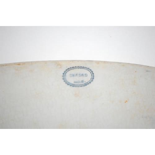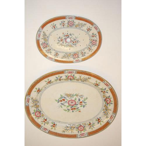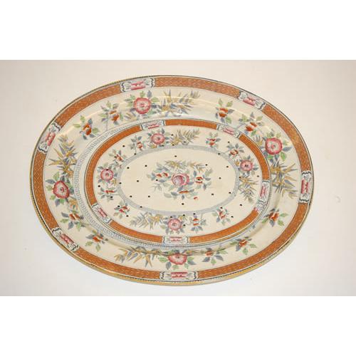 20" OXFORD PATTERN STAFFORDSHIRE PLATTER & DRAINER INSERT - POLYCHROME PLATTER & DRAINER INSERT W/ FLORAL & BAMBOO LEAVES DECORATION W/ GREEK KEY INNER BORDER & ORANGE PATTERNED BORDER-MARKED OXFORD H.B. (20" L X 16 1/2" W) - WEAR, GLAZE CRAZING, STAIN