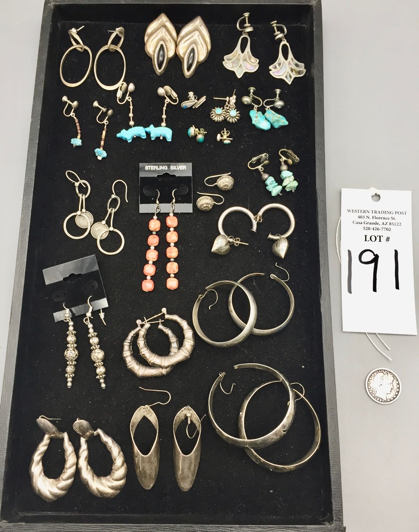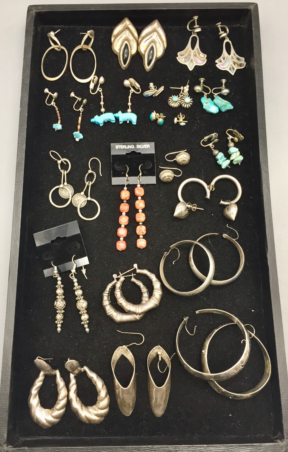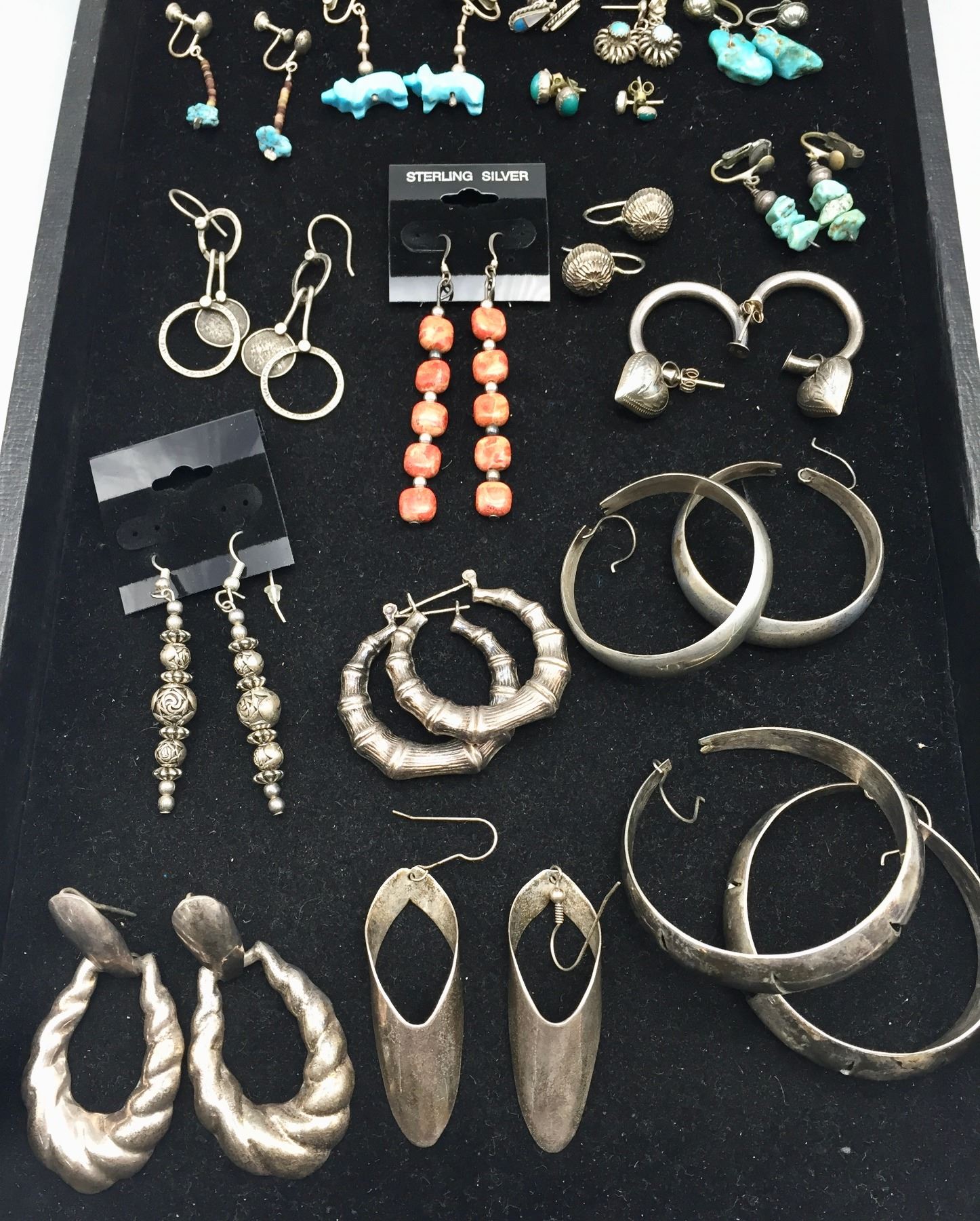 Description: Included for sale in this lot are 20 pairs of earrings varying sizes and styles. Most are sterling silver. Maker: Various.