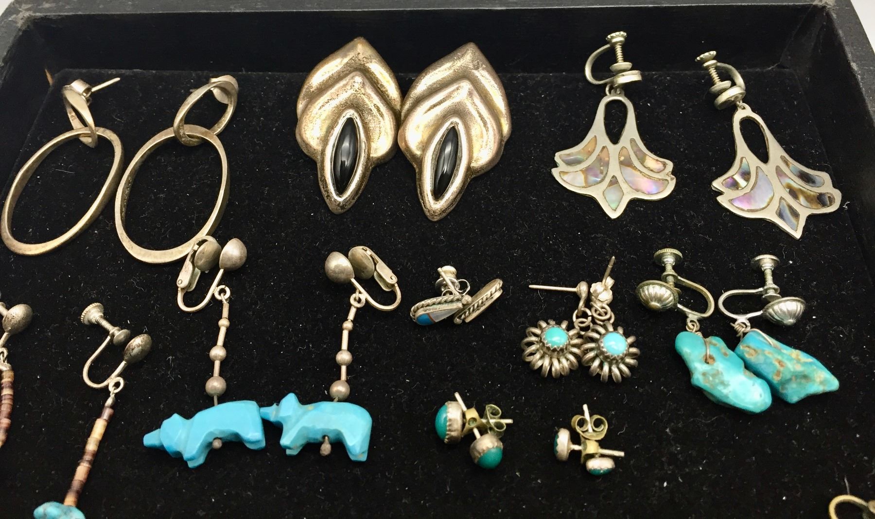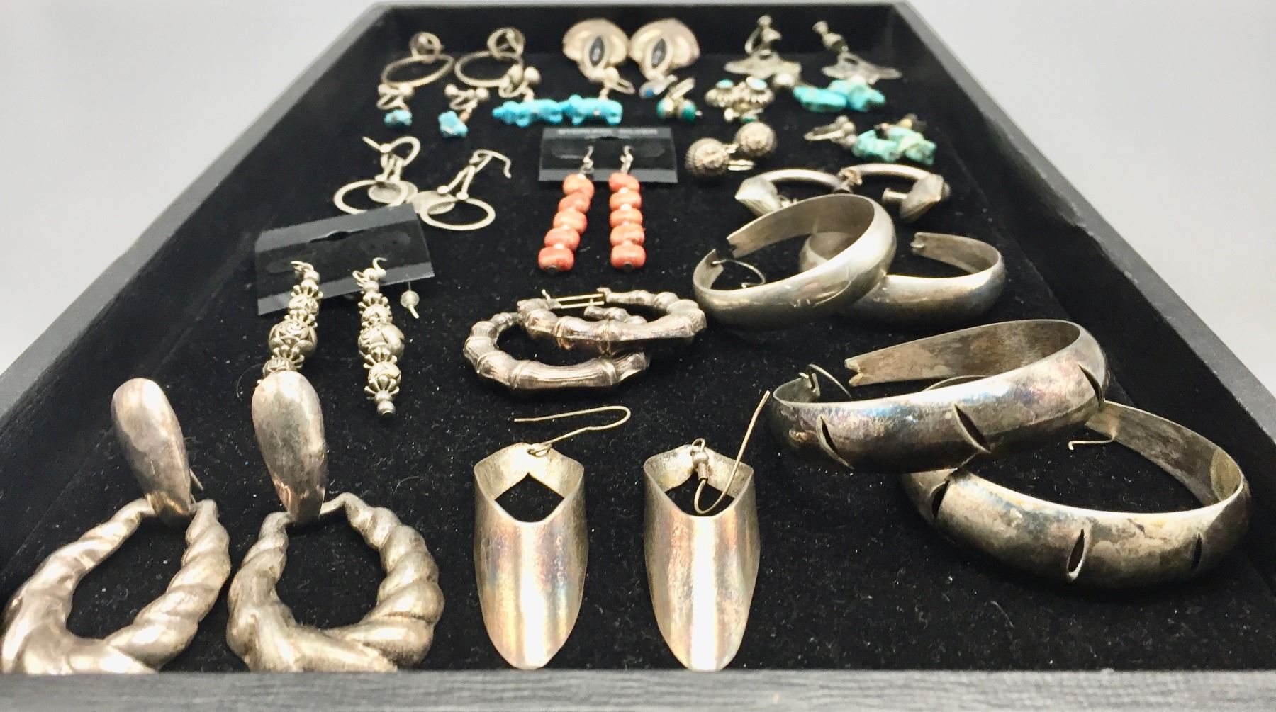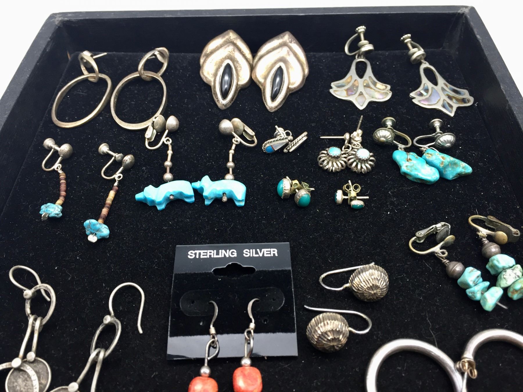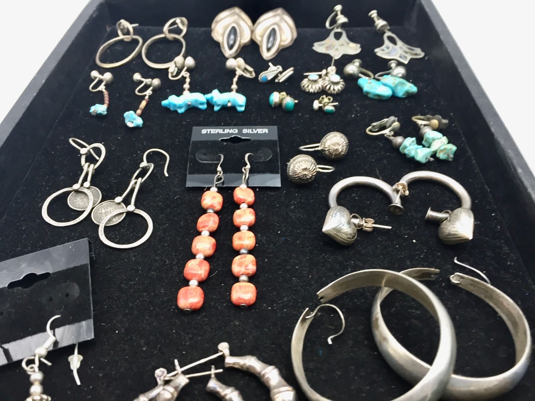 Description: Included for sale in this lot are 20 pairs of earrings varying sizes and styles. Most are sterling silver. Maker: Various.