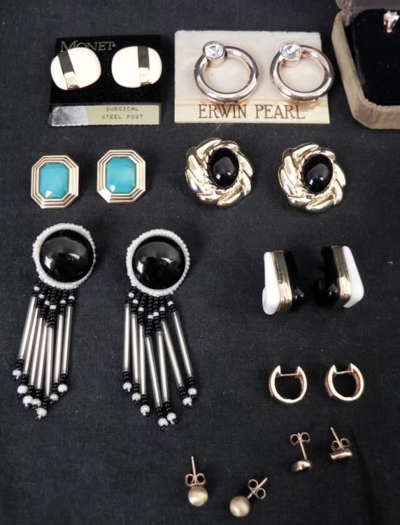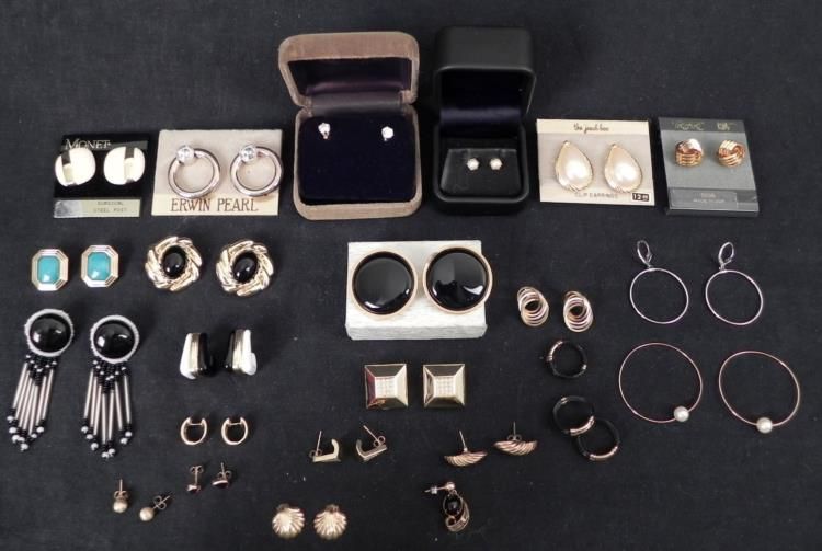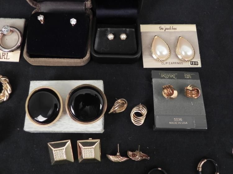 These 20 + pieces of costume jewelry earrings feature a variety of styles, all in very good to excellent condition. They include mostly pierced and some clip-ons, with hoops, studs, beads, gold tone, and dangling. Makers include Trifari, and Erwin Pearl,