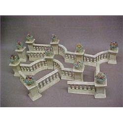 Twenty piece set of miniature ceramic fitted baluster railing, and pedestals with flower baskets, including six straight railings, each 6" long x 3" h., three 6 1/2"long x 3" h. curved railings, and ten pedestals with flower baskets 6" high. A few pieces with chips, C.1900, impressed Italy on bottom