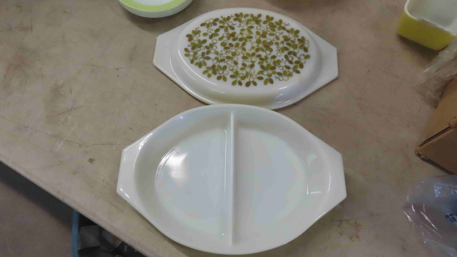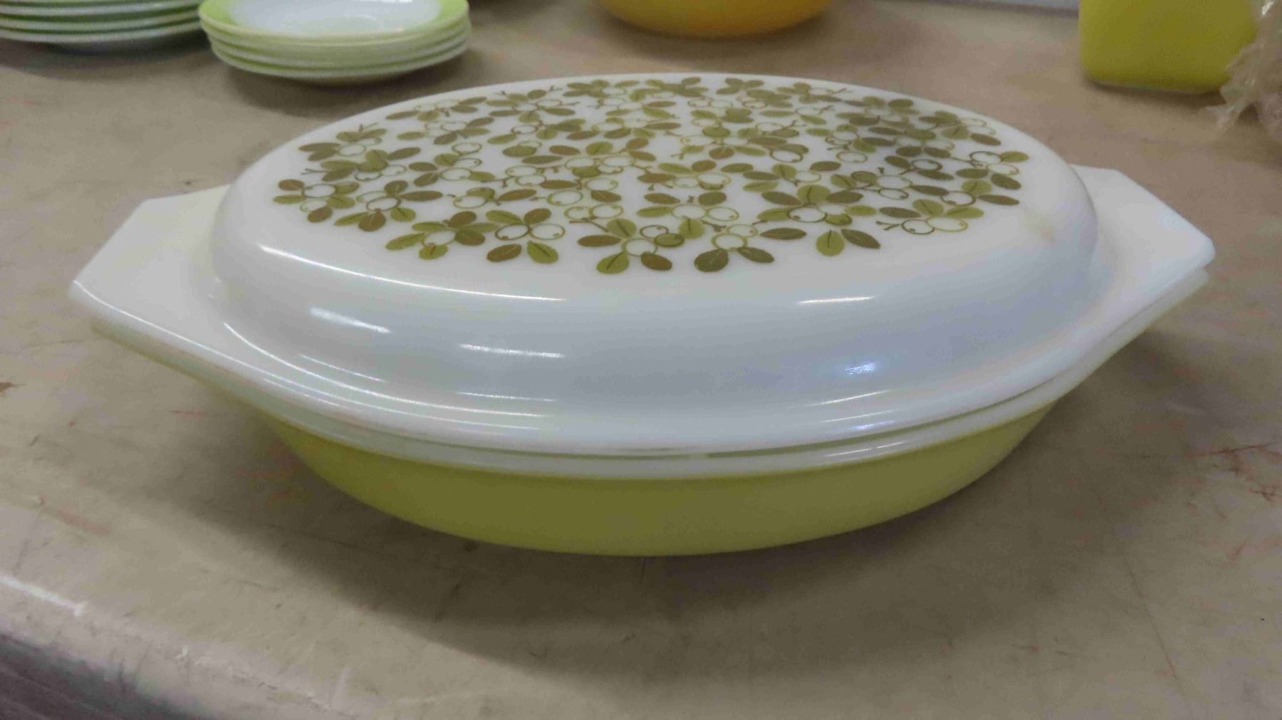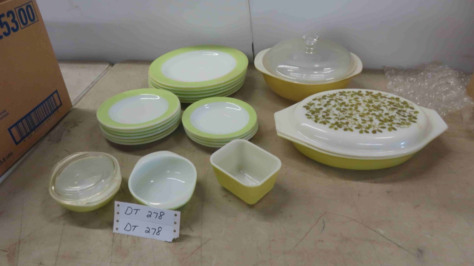 20 Pieces Yellow/Green Pyrex Dinnerware , 2 Casserole Dishes with