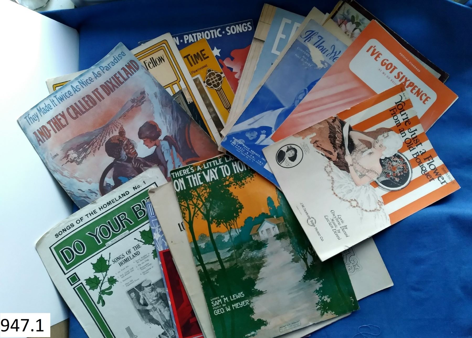 20 Pieces of Vintage Sheet Music. Lots with beautifully-lithographed covers, with such topics as Black Americana and Military.