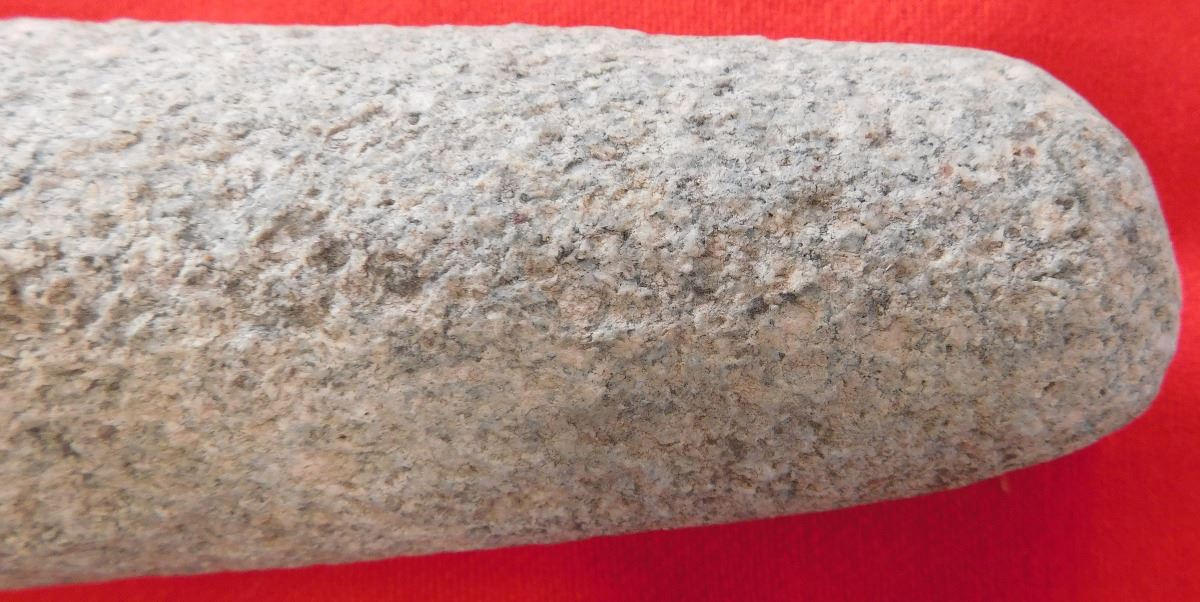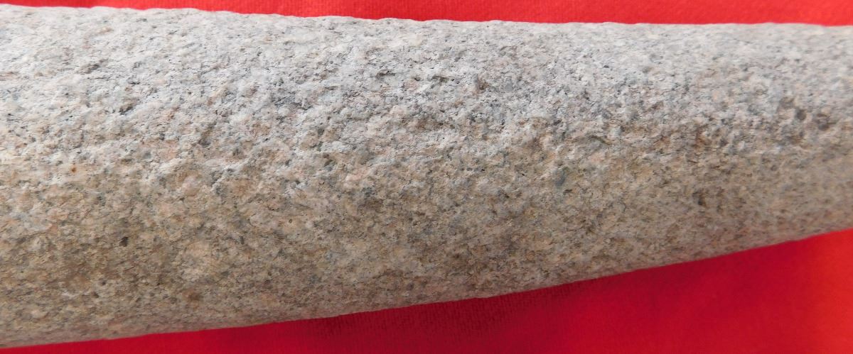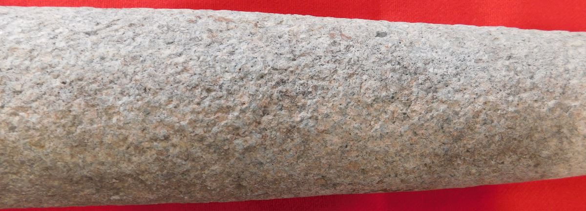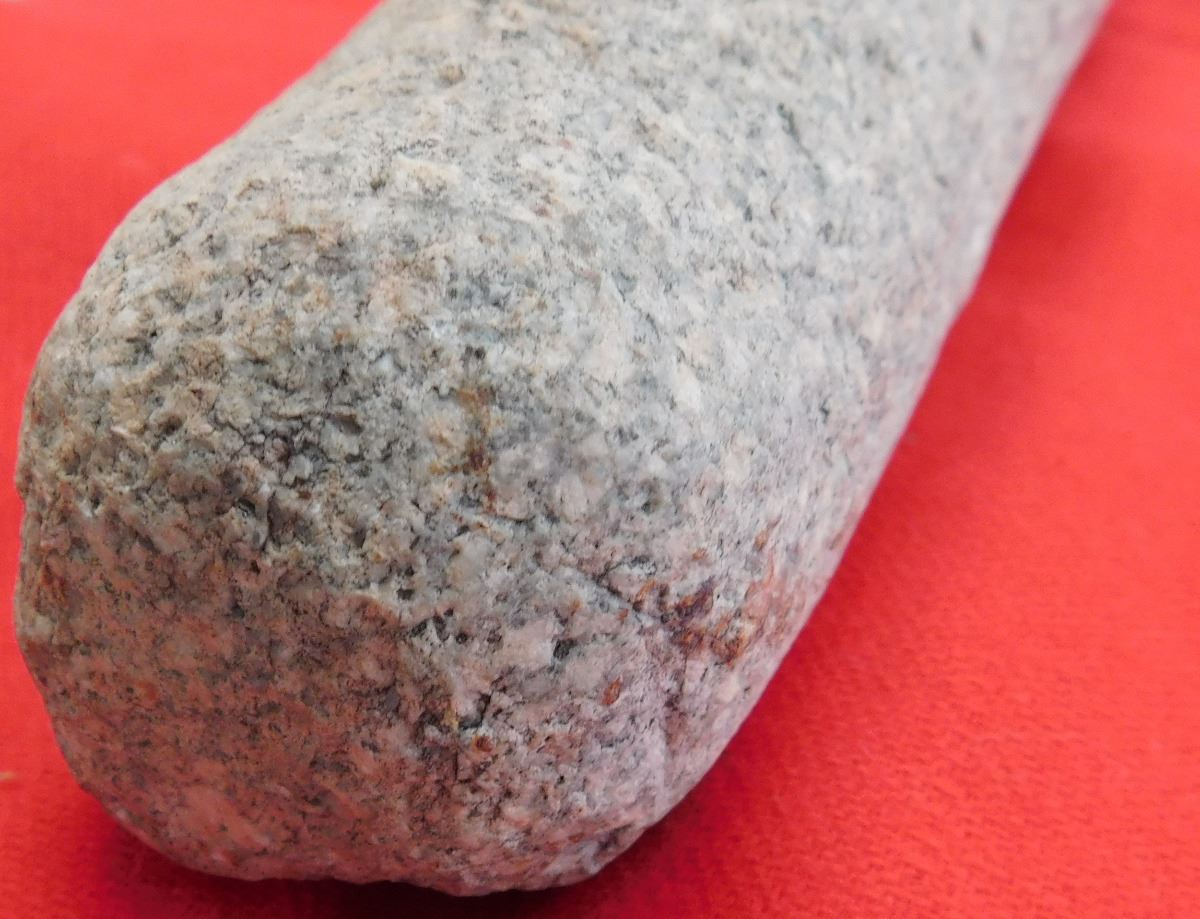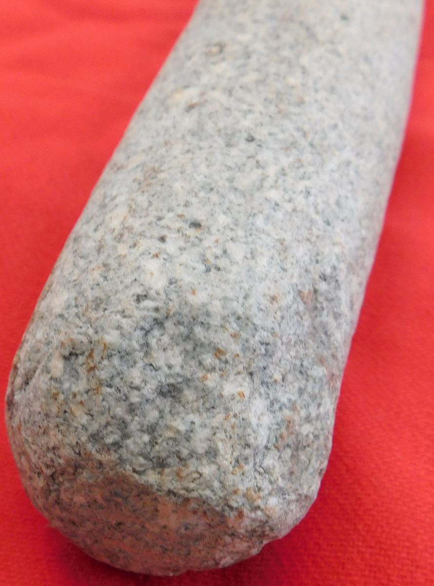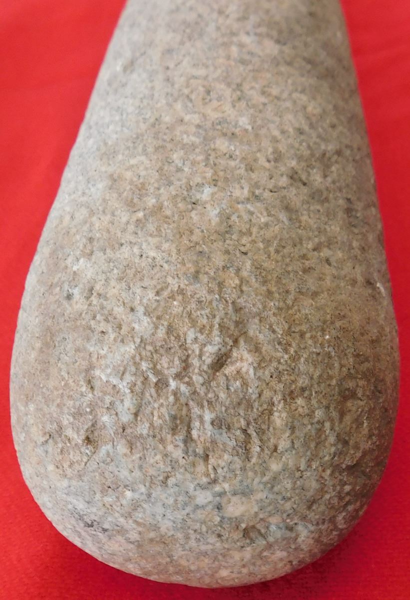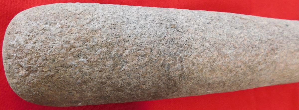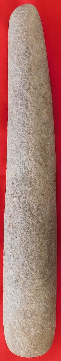 20" Pre-Historic California Pestle, 2000-3000 years old. Likely formed of basalt, this item measures 20" and 10" around at widest point. Found in San Clemente, Calif., by father of owner in the 1930s. This pestle has a slight knob top. Condition: Minor damage to one end from use, see images. Shipping: $30.00, requires double-box.