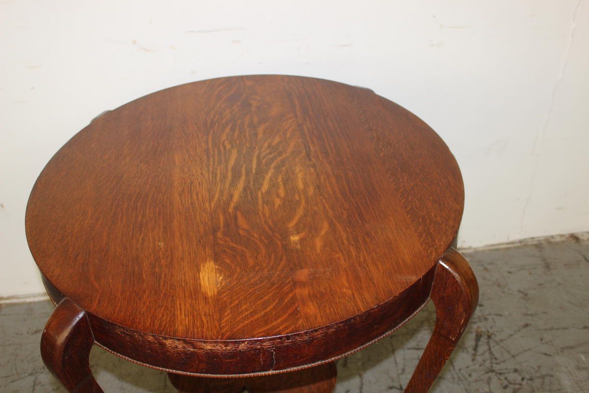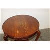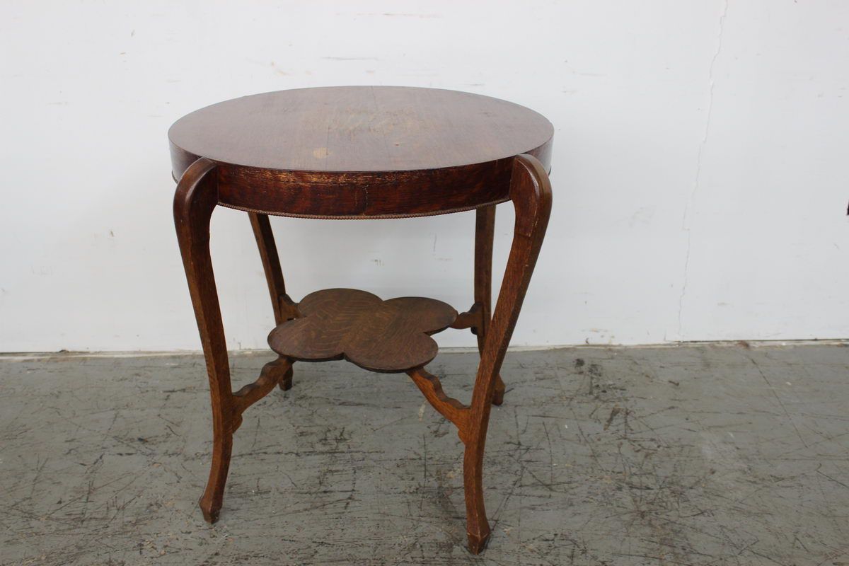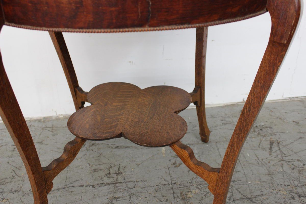 20" ROUND OAK DRUM TOP PARLOR STAND W/ BEADED SKIRT - 4 LEAF CLOVER UNDER SHELF - BOWED LEGS