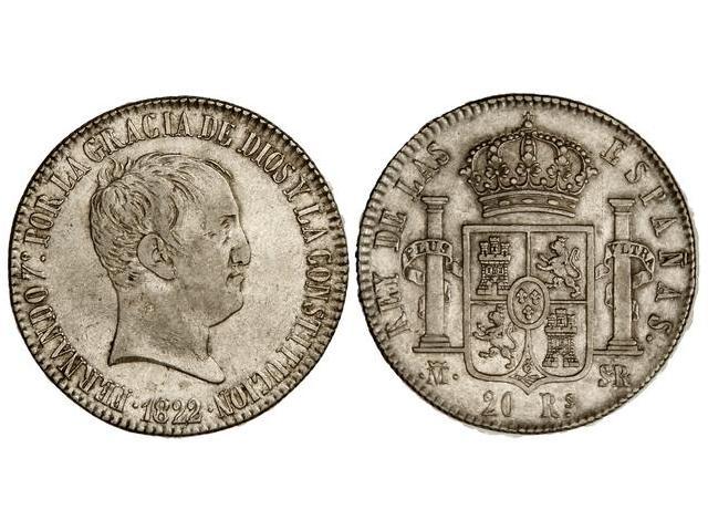 20 Reales. 1822. MADRID. S.R. Parte de brillo original. (Leves golpecitos en anverso y pequeña rayita en reverso). Cal-516. MBC+/EBC-.