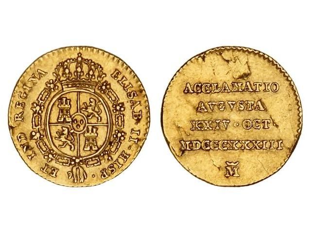 20 Reales. 1833. MADRID. AU. Medalla de proclamación. (Hojitas y algo repintada en reverso). Cal-118. MBC+.