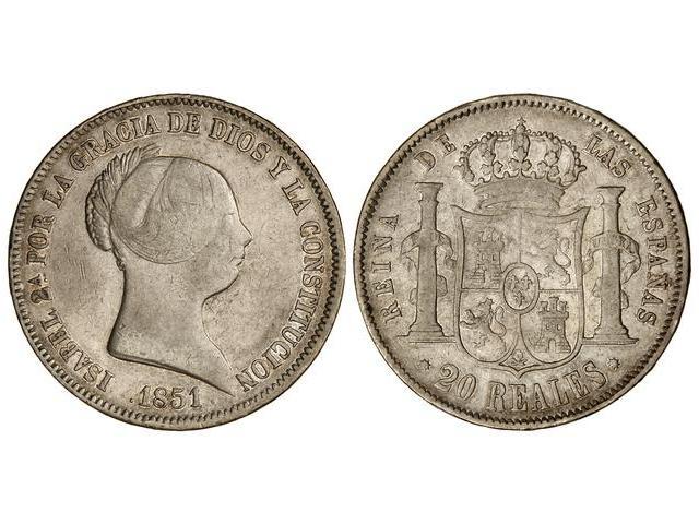 20 Reales. 1851. BARCELONA. (Golpecito en canto). ESCASA. Cal-152. MBC-.