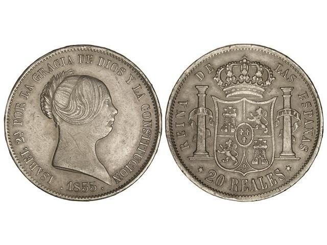 20 Reales. 1855. MADRID. Pátina. (Pequeños golpecitos). Cal-175. MBC+/EBC-.