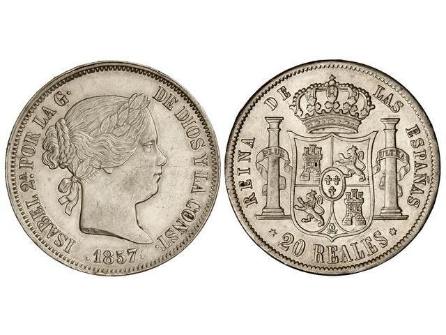 20 Reales. 1857. MADRID. (Levísimos golpecitos en gráfila). Cal-179. EBC.