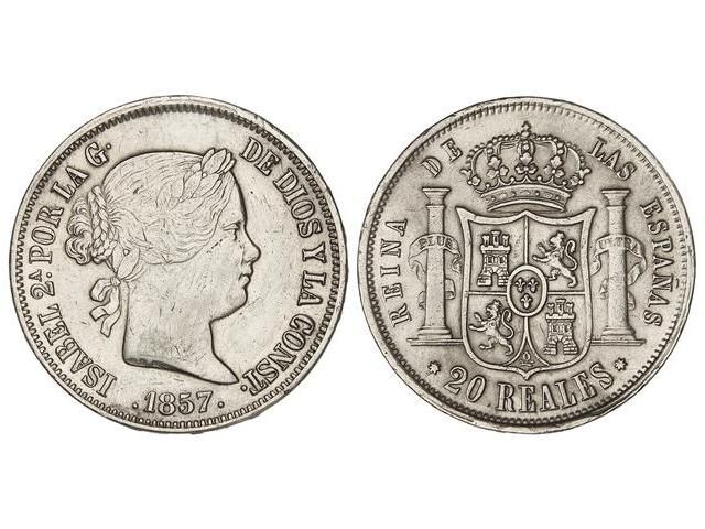 20 Reales. 1857. SEVILLA. (Rayitas y golpecitos). ESCASA. Cal-195. MBC+.