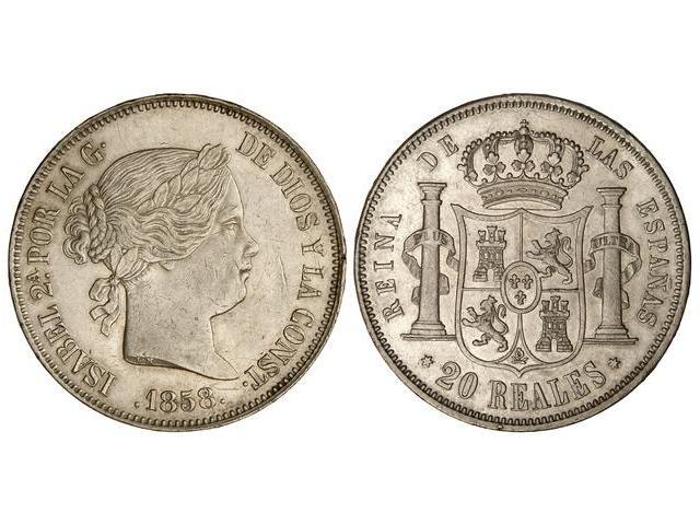 20 Reales. 1858. MADRID. Parte de brillo original. (Rayitas y golpecito en canto). Cal-180. EBC-/EBC.
