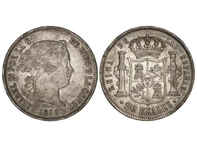20 Reales. 1859. MADRID. Ligera pátina. (Ligeros golpecitos en canto). Cal-181. EBC-.