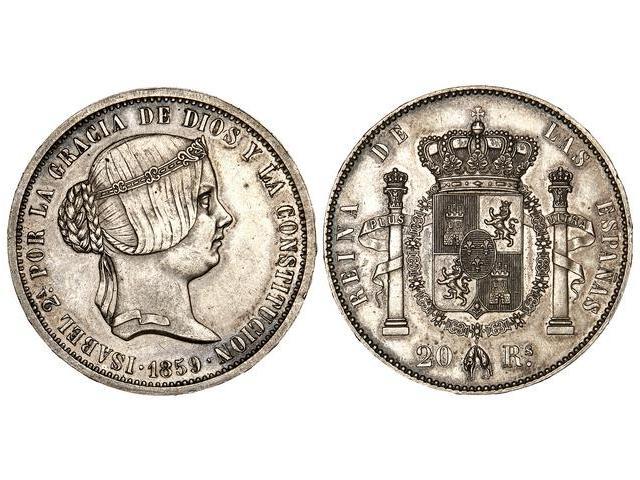 20 Reales. 1859. PRUEBA no adoptada (MADRID). AR. Realizada por Fernández Pescador. Leyenda en canto: LEY/PATRIA/REY. (Golpecitos en canto). Cal.Pág-772. PRUEBA.