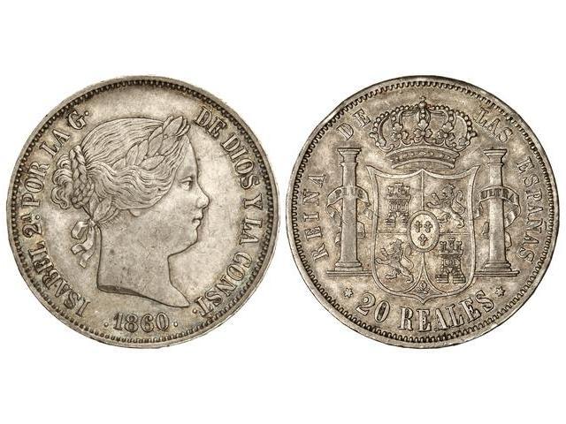 20 Reales. 1860. MADRID. Restos de pátina y brillo originales. (Golpecitos en canto). Cal-182. MBC+.