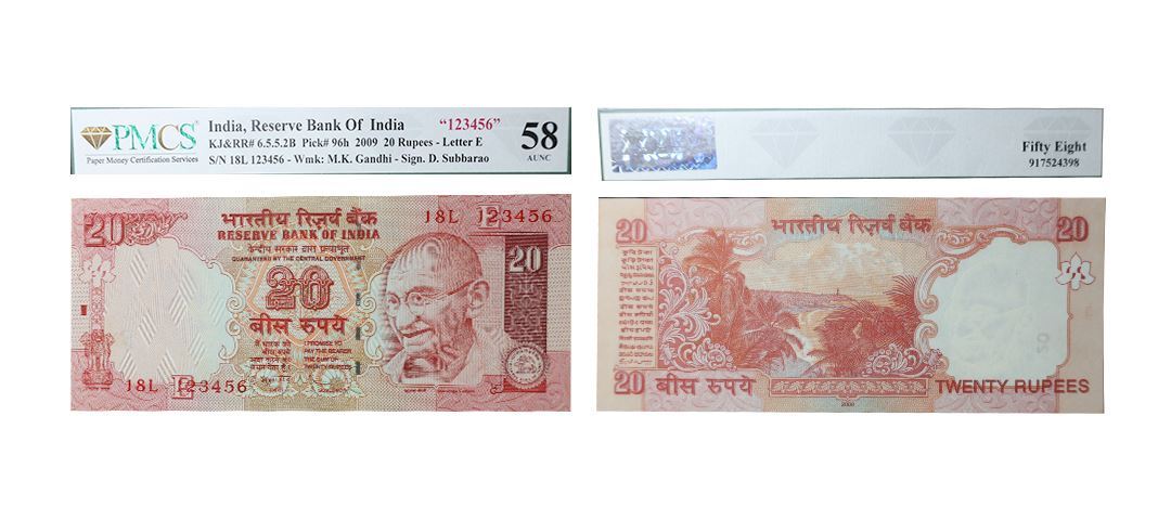 20 Rupees, 2009, Fancy Number, Ladder Numbers, Signed by D. Subbarao, Inset E, Serial No. 18L 123456, PMCS Graded Aunc 58, Rare.