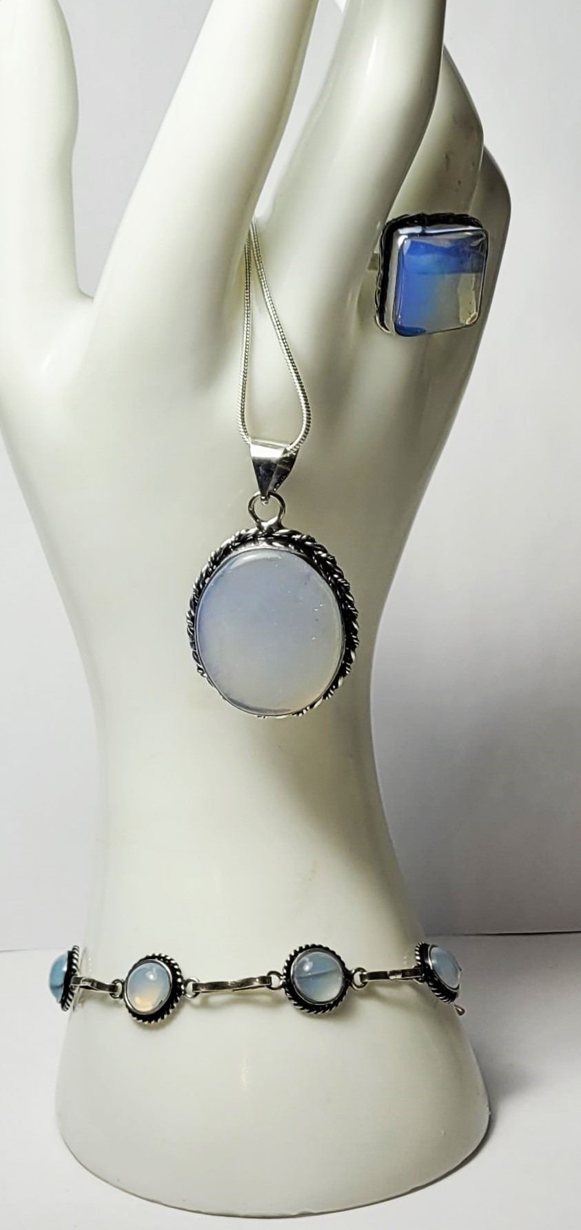 SIZE 8 SQUARE CUT RING, STAMPED 925, OVAL PENDANT ON 18" SNAKE CHAIN, 8.5" BRACELET WITH ADJUSTABLE TOGGLE CLOSURE. JEWELERY