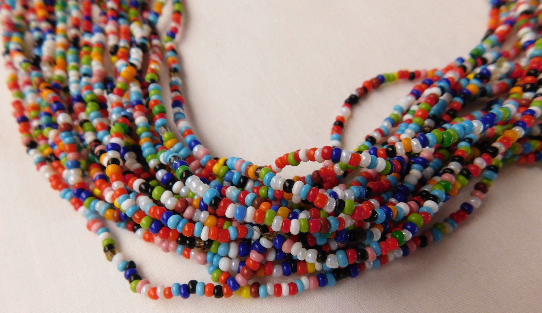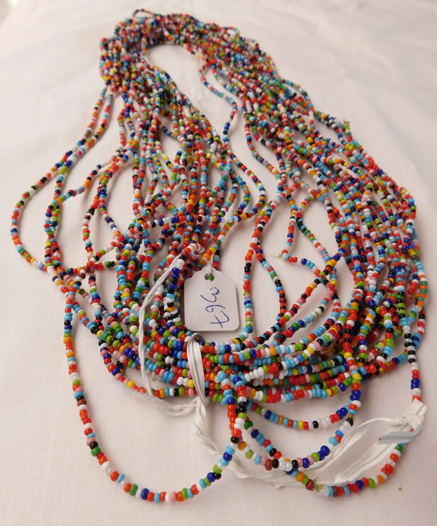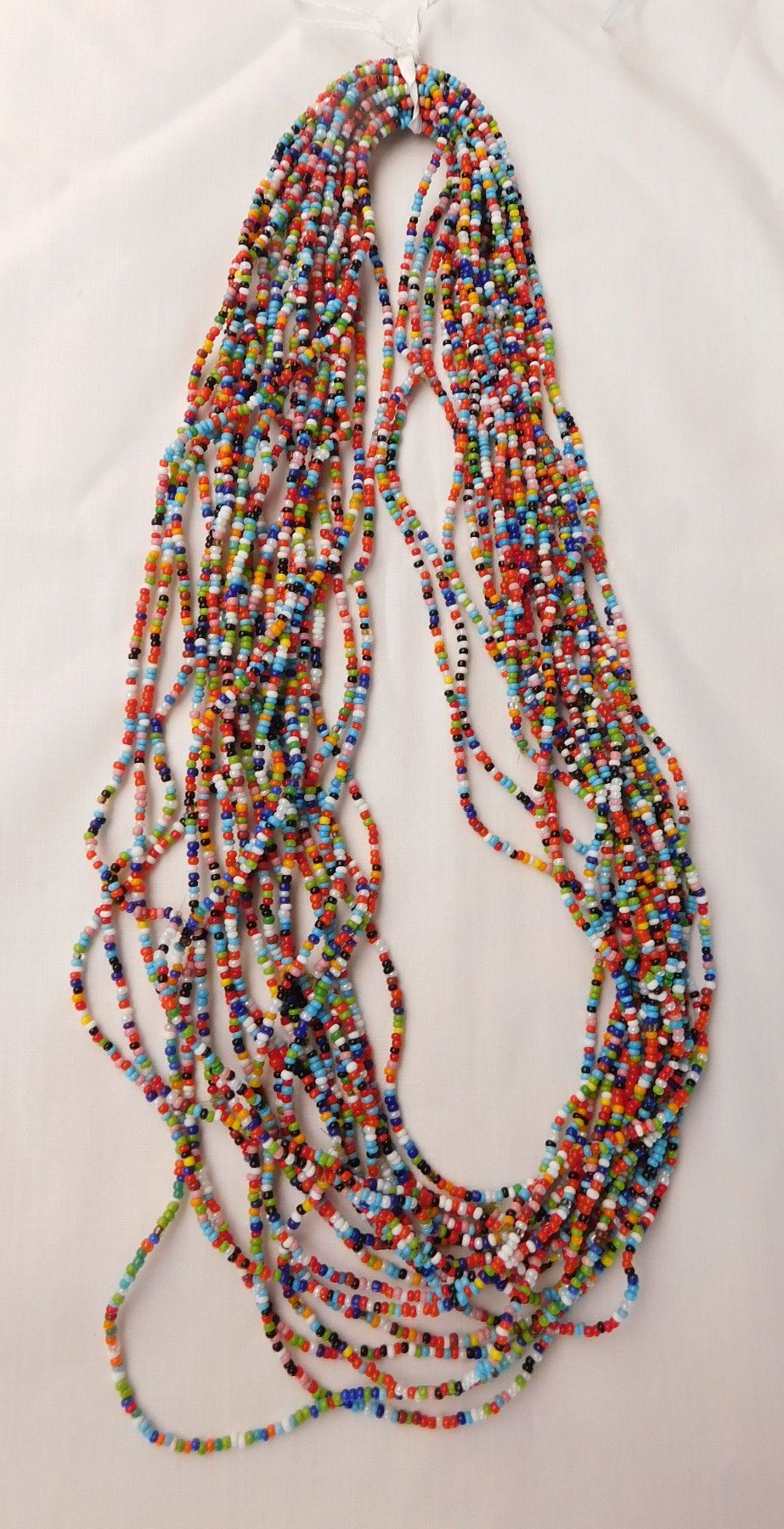 20 Strand Trade Bead Necklace, 20th century item. Made of glass, the item hangs about 12" long as worn. European. Condition: Good, see images. Shipping: $12.50 w/insurance and signature.