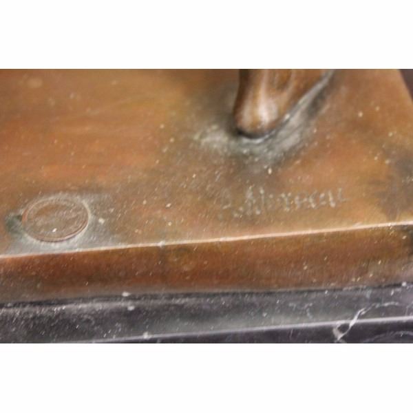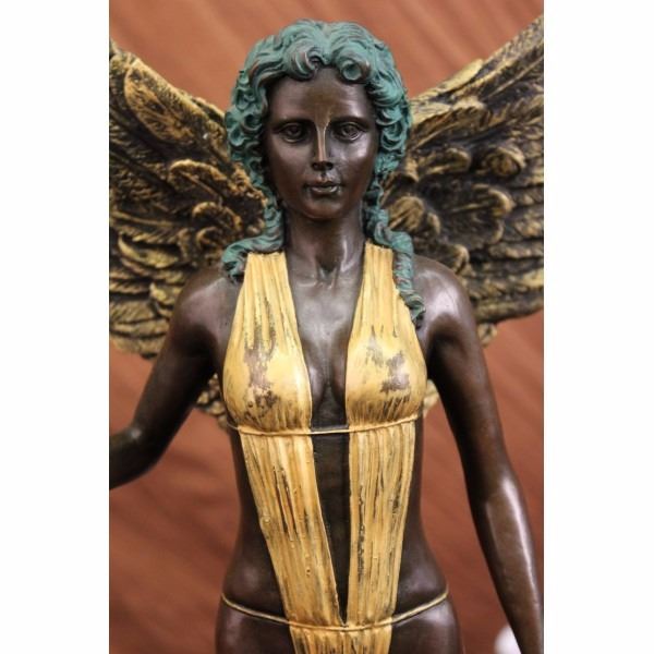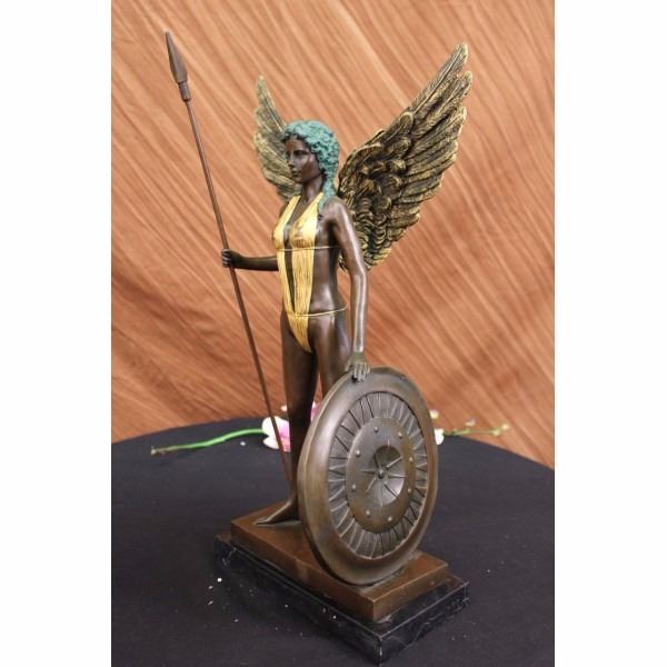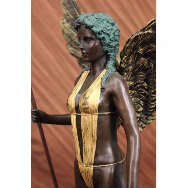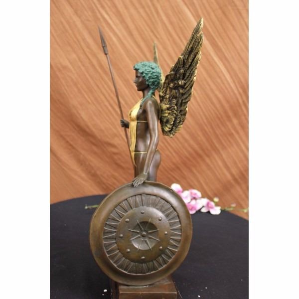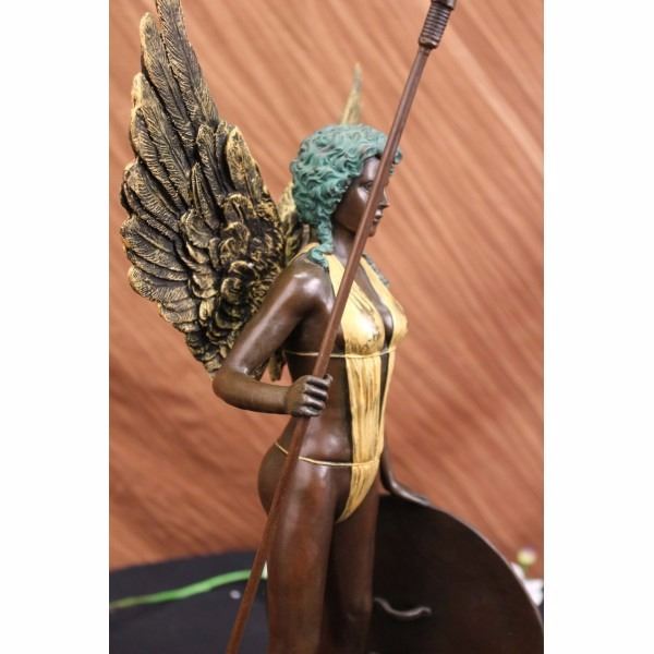 An Amazon warrior stands boldly, staring her enemy in the eye. She comes from a supernatural world and fights the immortal creatures that ravage it. She is armed with a tall spear and shield. Her spear is planted on the ground beside her, while she rests a hand on her shield. She wears a suit that clings to her curves. Her wings extend behind her.100% bronze and handmade, this brown patina sculpture was cast using the "Lost Wax Method" and mounted on a marble base and is signed A. Moreau. Condition: This sculpture is in perfect condition. Bronze Dimensions with Marble Base:Height 21" x Width 10" Marble Dimensions:9" X 5" Height without base: 20" Weight : 20 LBS Inventory : 44DS225B7044