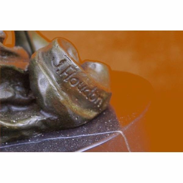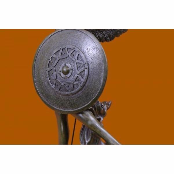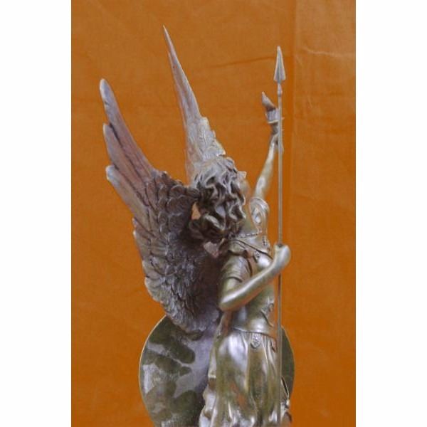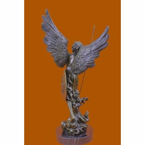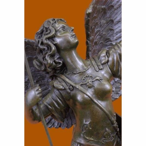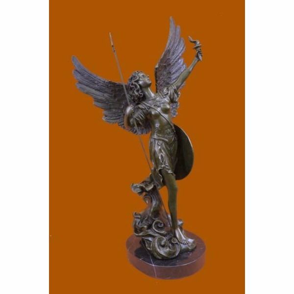 The Archangels are the captains of all the angels, having been created as the foremost hierarchs in the angelic kingdom. They are majestic beings who personify divine attributes and are at the service of the mankind of earth. They work tirelessly to defeat evil and promote good. Archangel Gabriel, who's name means "Hero of God," is the bearer of GOOD NEWS as the voice of God. This archangel is a messenger who whispers in our ear of coming events, changes, and opportunities for new experiences He restores life and light into stagnant areas of your life such as relationships, businesses, households, etc. Although angelic beings are genderless, Gabriel is the only Archangel who has occasionally appeared in a distinctly female form. This bronze look statue of Archangel Gabriel in female form has hand-painted accents, and shows exquisite detail. Gabriel stands prepared for battle, with sword in hand. The statue is impressive 20 inches tall, 10 inches wide and 9 inches deep. Made of solid bronze, it has the look and feel of very expensive bronze and is signed by artist Houdon.This statue makes a great gift for family and friends. Condition: This sculpture is in perfect condition. Bronze Dimensions with Marble Base:Height 20" x Width 10" Marble Dimensions: Diameter 6" Height without base: 19" Weight : 17 LBS Inventory : 40DS2597902