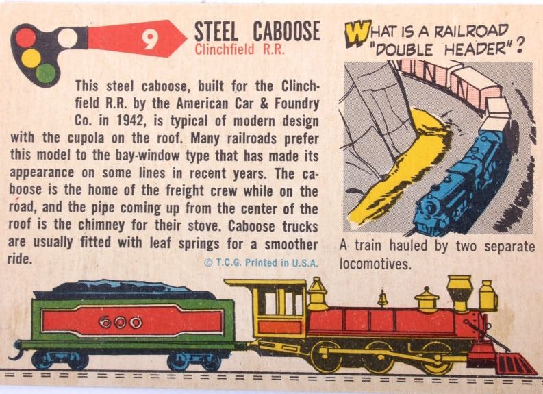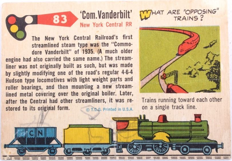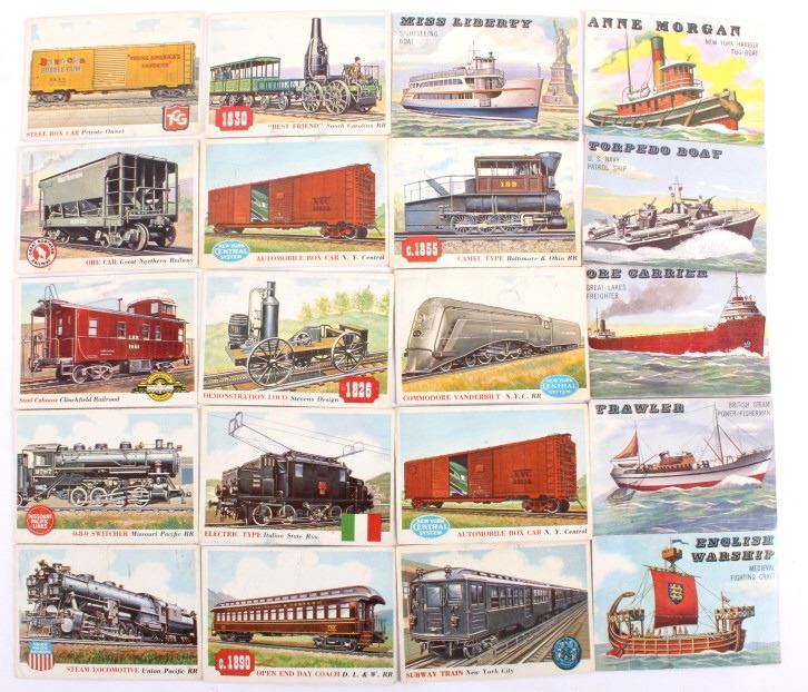 This lot contains 20 bubble gum collector cards. There are 14 train car cards as well as 6 ship cards. The train car cards include New York Central System Commodore Vanderbilt Locomotive and cars, Union Pacific, Missouri Pacific, & Clinchfield Railroad. The ships include Miss Liberty, Anne Morgan, Ore Carriers Torpedo Boat, Trowlers, & English War Ship. The cards are Late 50's to early 60's. The cards measure 3 3/4" x 2 1/2".