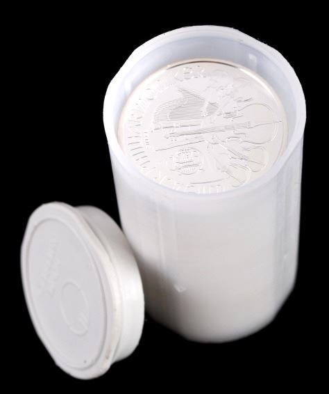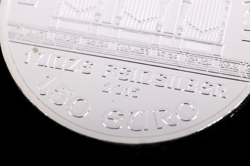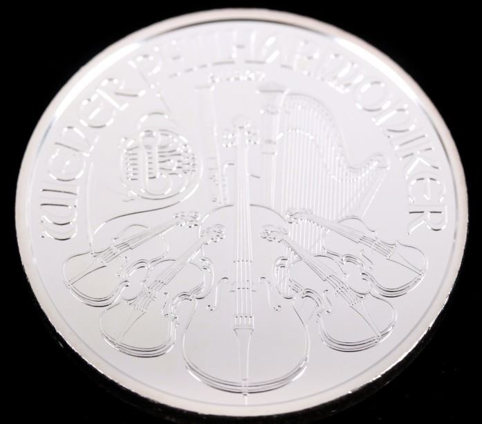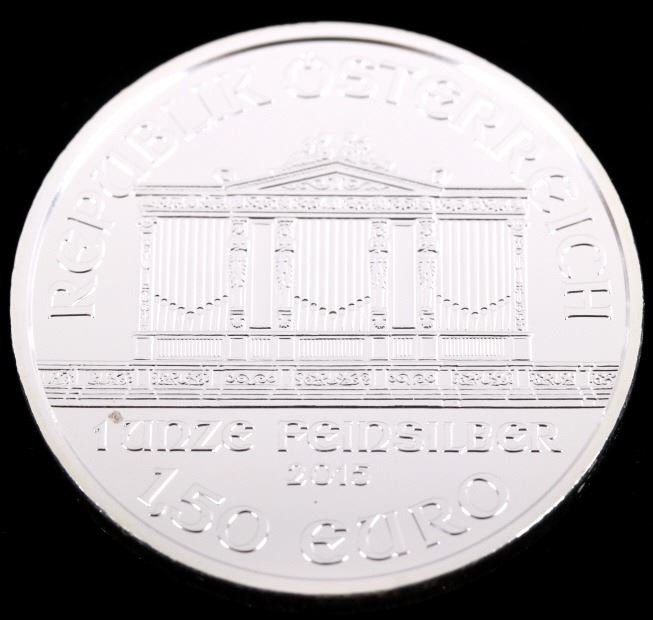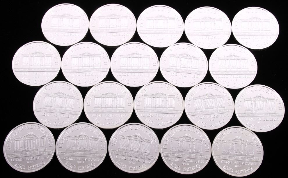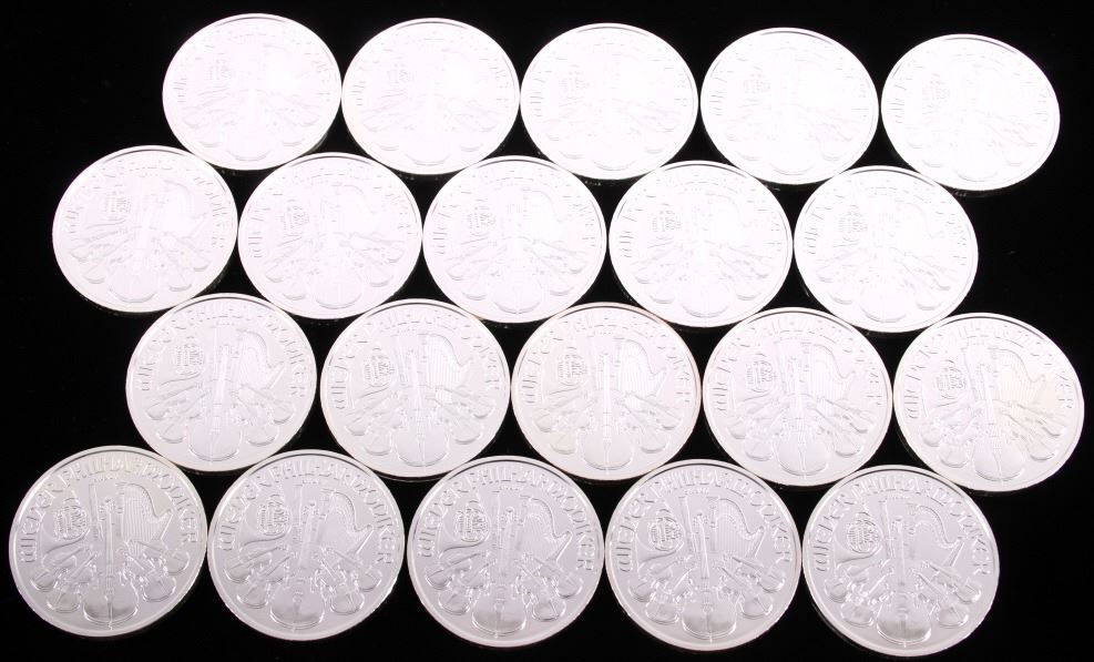 This lot features 20 1 Troy Ounce Fine Silver Austrian Minted coins. Each coin shows a Vienna Philharmonic motif, and reads "REPUBLIK OSTERREICH - 1 UNZE FEINSILBER - 2015 - 1,50 EURO" on one side, and "WIENER PHILHARMONIKER - SILBER" on the reverse. Overall, the coins are in near mint state, and shows a gorgeous white silver tone. The coins are stored in a preservation case, which measures 3" tall, and 1 5/8" across.