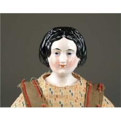 20” UNUSUAL PINK LUSTRE CHINA. An unprecedented china with great molding! A slightly haughty look with a pursed mouth, molded eyelids, and a fancy hairdo add to the desirability of this doll. Upon close examination, one notices the center part that is embraced by the braided hair crossing the crown and twisting into a bun at the back of the head. On a cloth body with leather arms, wearing a cotton print dress and an olive green apron with red piping, a collector might look years to obtain a doll of this quality and rarity. She has a molded dress plate with three sew holes in front and also in rear. SIZE: 20” t. CONDITION: Overall condition is excellent; minor divot to china on forehead. JL 1-4428 (1,400-1,800)