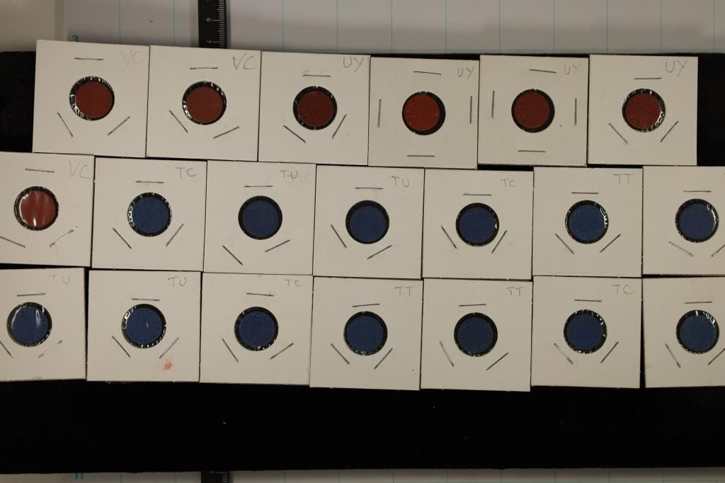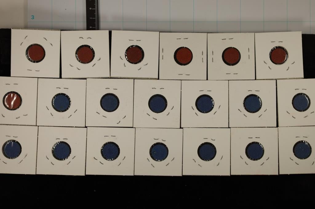 TOKENS, 7 RED AND 13 BLUE, MADE FROM WOOD PULP