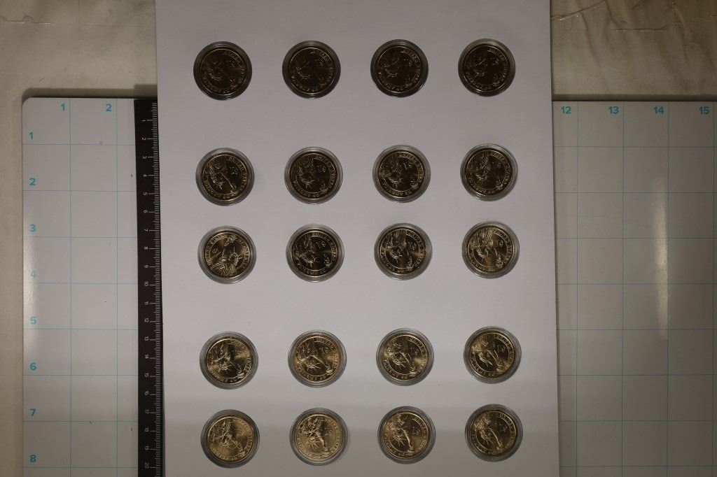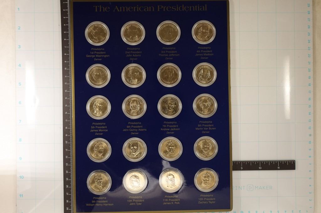 P & D WASHINGTON, P & D ADAMS, P & D JEFFERSON, P & D MADISON, P & DMONROE, P & D QUINCY, P & D JACKSON, P & D VAN BUREN, P-HARRISON, P-TYLER, P-POLK AND P-TAYLOR. ALL IN HARD PLASTIC CAPSULES MOUNTED ON LARGER