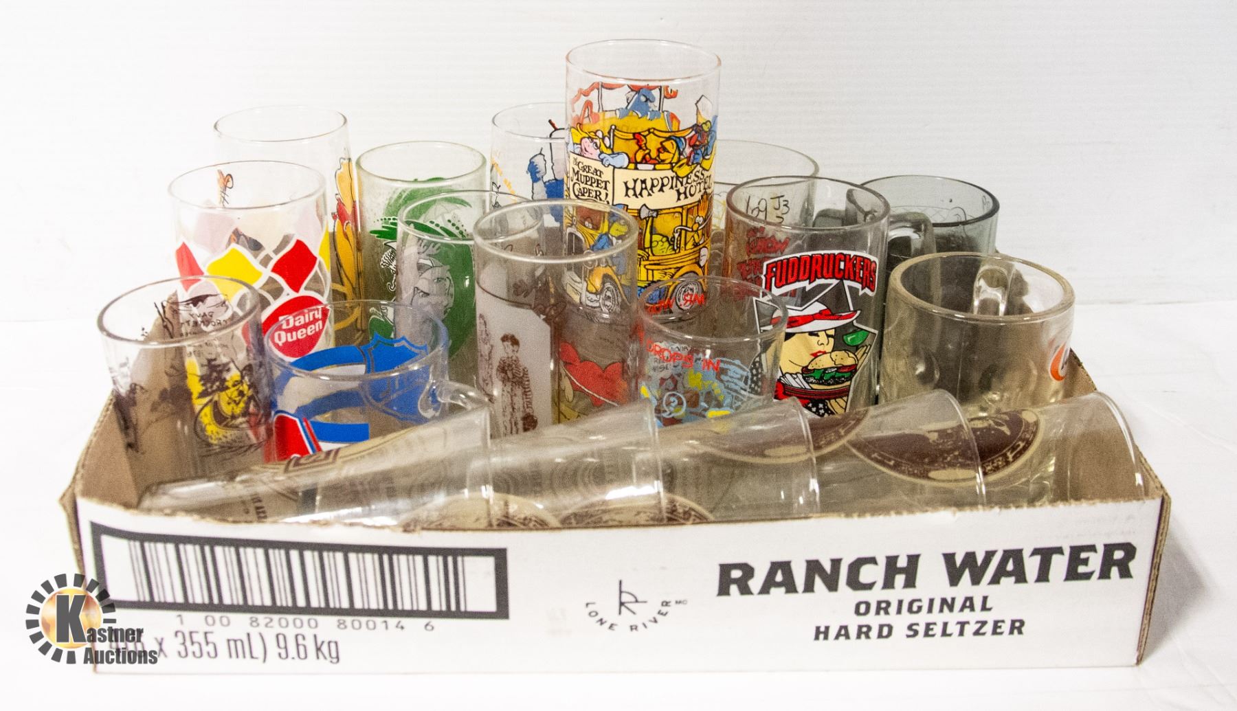 20 VINTAGE COLLECTIBLE GLASSES. COKE, CPT. CROOK,