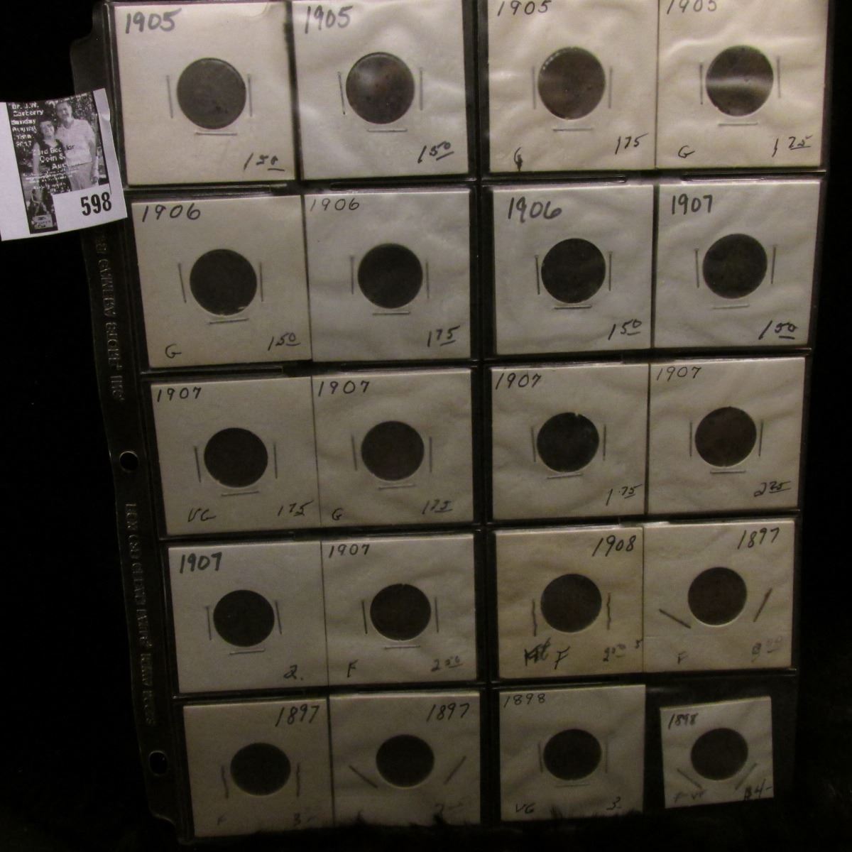 (20) Various Date Indian Head Cents dating 1897-1908 with grades up to VF in a plastic coin page.