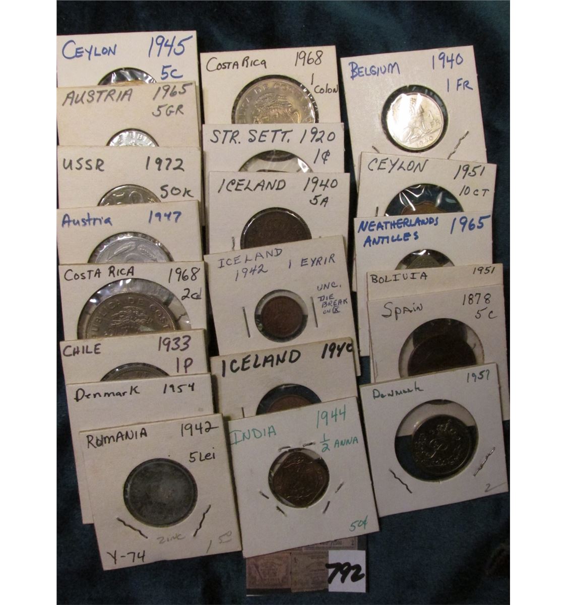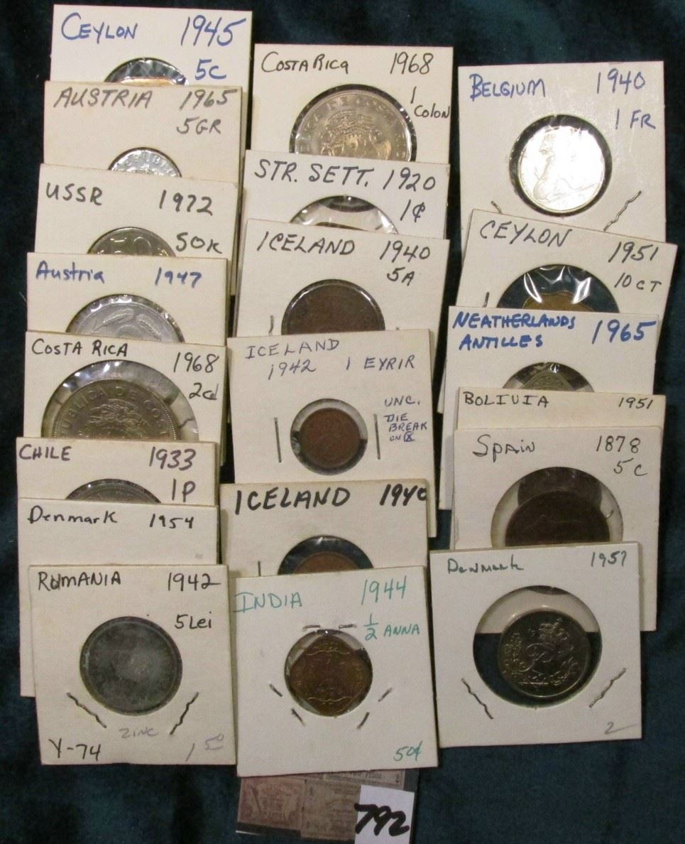 (20) Various Foreign Coins in 2" x 2"s, all attributed, and date back to 1878. Valued at $30+.